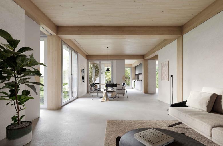 Die Grundrissanordnung ermöglicht attraktive Wohnungen mit Ausrichtung zu mehreren Himmelsrichtungen und Aussenräumen über Eck, was einen weiten Blick ins Grüne ermöglicht. Die Wohnräume sind mit natürlichen Materialien gestaltet. Der Holzelementbau ist hierbei atmosphärisch prägend und bietet als Skelettstruktur höchste Flexibilität und Anpassbarkeit, um ohne grosse Eingriffe in die Substanz auch künftigen Wohnkonzepten gerecht werden zu können.