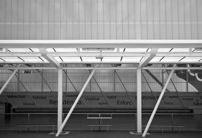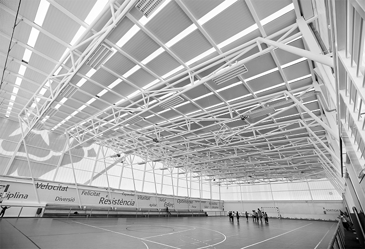 Ciutat de Reus: The "polilleuger" of CEIP Ciutat de Reus appears in the need to cover the existent sport ground. The project spans the whole plot, so it takes the advantage of adapting a second sport ground, the exterior games area, the children patio, the acces area and the perimetral fence. Both the structure and the facade's material are studied based on sustainability criteria and the posterior maintenance cost of the facilities. So it archieves a very light weight project with a execution cost per m2 way lower than the standard module establish by the official organization. Alberich i Cases: The "polilleuger" project is intended rethink architecture based on new concepts of sustainability and low maintenance. The field is covered by a tubular metal supports lined of sandwich panels and polycarbonate sheets. That same cellular translucent polycarbonate is also used on the front, while the other elements (harrows, services, changing rooms, storage …) are made of concrete. The result is a facility that has a low cost of implementation without resign a formal and spatial quality with a completely contemporary look. Celia Artiga: The good results obtained by the two previous "polilleuger" experiences encourage the Reus City Council to make a third one. In this case, the intervention is not limited just to the sports hall and the development of its immediate environment, but rather extends beyond the boundary of the plot. Thus, in addition to attending social and economic circumstances of the moment, the project is considered in four distincted phases: the "polilleuger" the interior complex and its surroundings, bleachers and the new inverted traffic priority step.