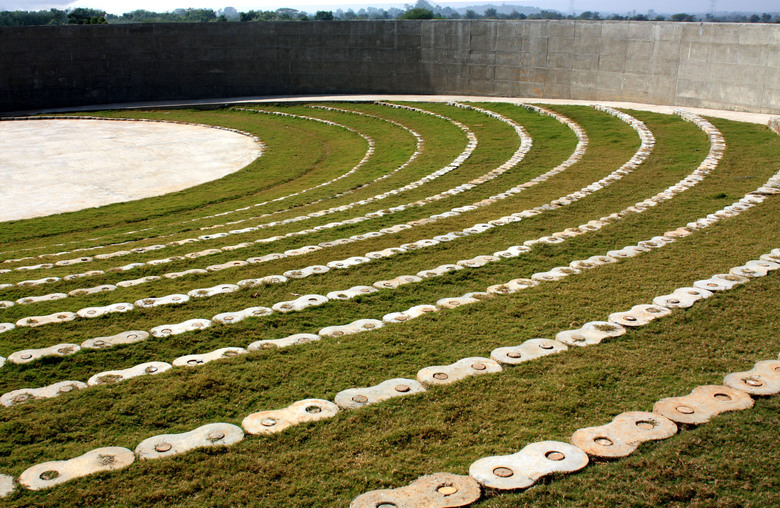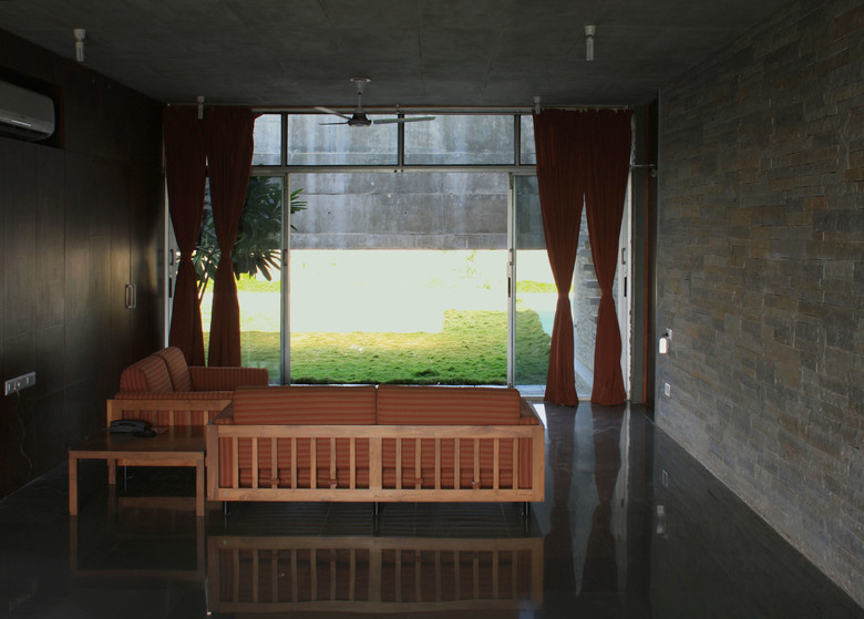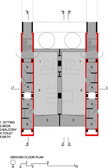 These seven stark service blocks, each of a 1:4:8 proportion and the 4:4:2 entrance mass come together volumetrically to form a perfect cube when reflected in the water of the adjacent lake, which is meant to be diverted up to the building line in the next phase of construction. Even the amphitheatre complies with this stringent geometry with a diameter of four times the basic 2.4m unit. The final effect was conceived to be like a chant, simple and repetitive, its power being in the resonance with the self inside and the extension of the self outside.