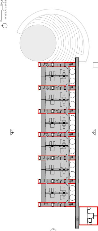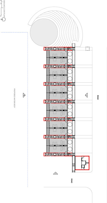 A typical Jain temple consists of linearly arranged sequential spaces beginning at the ornate entrance , leading up to a Mantapa or hall and terminating in the sanctum or garbha griha which is topped by a tower known as the Shikhara, the entire complex is then flanked on either side by the shrines of the Tirthankaras, the founders of Jainism. This arrangement is reinterpreted in the plan of the Dharamsala with the strong linear axis maintained and translated into a defining walkway which runs along the entire length of the building. A block is created to define the entrance at one end and the Mantapa transformed into an amphitheatre defines the other. The image of the Shikara is retained in the proposal for a bird tower and the shrines flipped along the central axis and stacked onto one side create the rooms and complete the complex.
