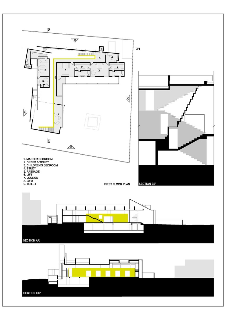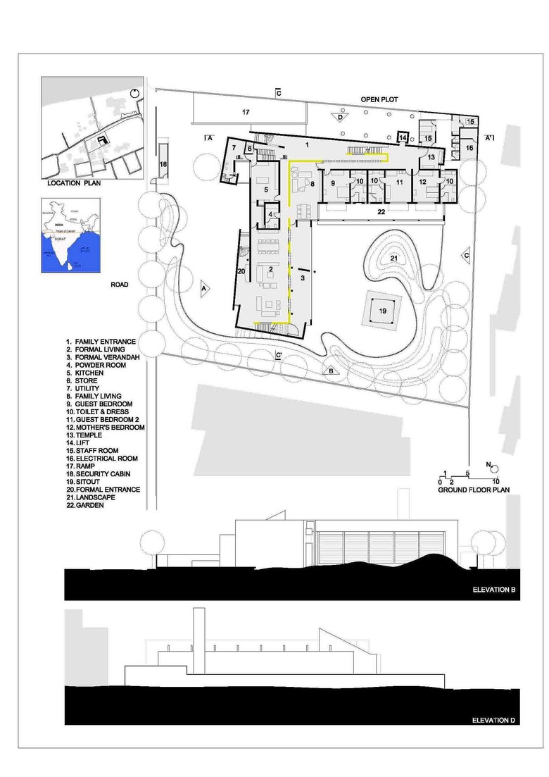 In heart of the diamond capital of India, Surat; is a house that allows the deeply rooted traditions of the diamond industry to co-exist harmoniously with the changing needs of a modern home, blending the dichotomy of the situation into a complementary whole. Sitting between an anonymous plot and the house for Parag Shah (house with warped court), the complex geometry of the site is used as a cue to develop its spaces such that all areas of the house open out onto a tranquil and private green space. (Photo 3)