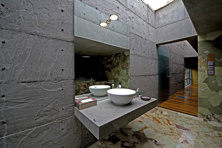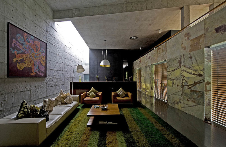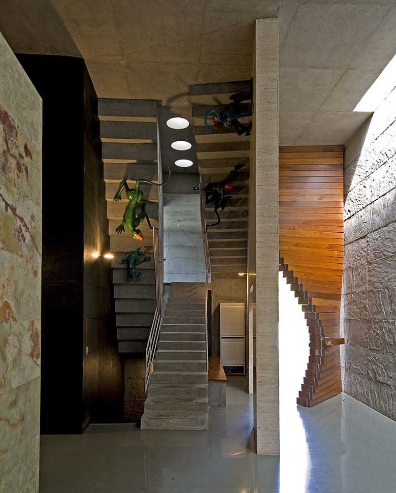 On entering the site, one encounters a ramp down to the parking level and the blank concrete walls, the green of the lawn near the entrance enfolding a few seconds after. The house can be entered from two sides, both through large, custom designed entrance doorways that transform into a wooden curtain and gently open into the entrance hallways. (Photo 1) The two separate entrance hallways allow the smaller home and the larger house to coexist; one opening into the family spaces and the other leading directly into the formal drawing and dining space and veranda outside. (Photo 5) The high formal living space in concrete can also be distinguished by the skewed box, representing the industry. The double height entrance hallway also serves as a meeting place for the household and a connecting space between the formal and informal.(Photo 6) At one end of the passage, and accessible to all, is the family prayer room and the study above, giving religion and intellect its fair place in the house, respecting their everyday importance in the home.