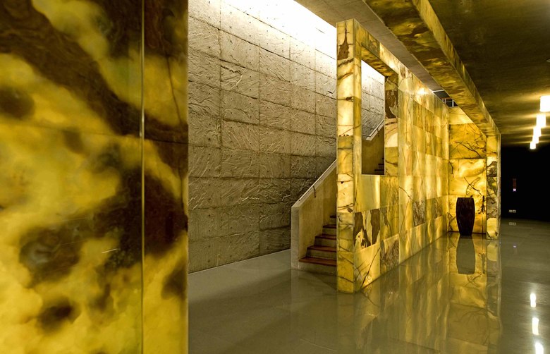 The dwelling emulates the various facets of the jewel in several ways through the use of contrasting materials. The rough diamonds are represented by the concrete walls poured in stone casts and the polished ones are represented by the light emanating onyx wall. One is opaque, the other transparent. (Photo 7) One envelops the house and the other ties the house together. One absorbs, the other radiates, one is neutral, the other colourful, one is rough and the other is smooth, diametrical opposites in the same house. The core family and private areas are placed in a “black box” characterised by the use of kadapa stone representing carbon, another avatar of the diamond. The base flooring in economical and common but robust kota stone as if representing continuity, and all this is set against the chic neutrality of travertine representing contemporary living. (Photo 2) The industry dwells in between the incoming rough and the outgoing polished stone in all its entirety; static, dark and unyielding spaces placed amidst sunlit areas- dynamic, light and agile.