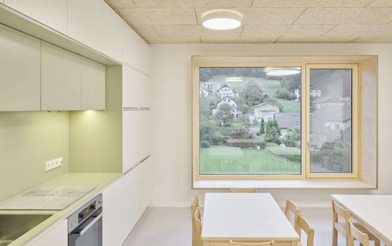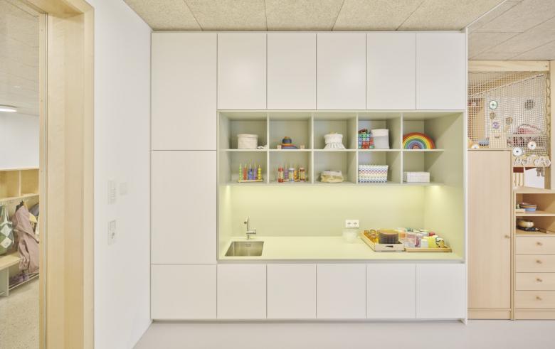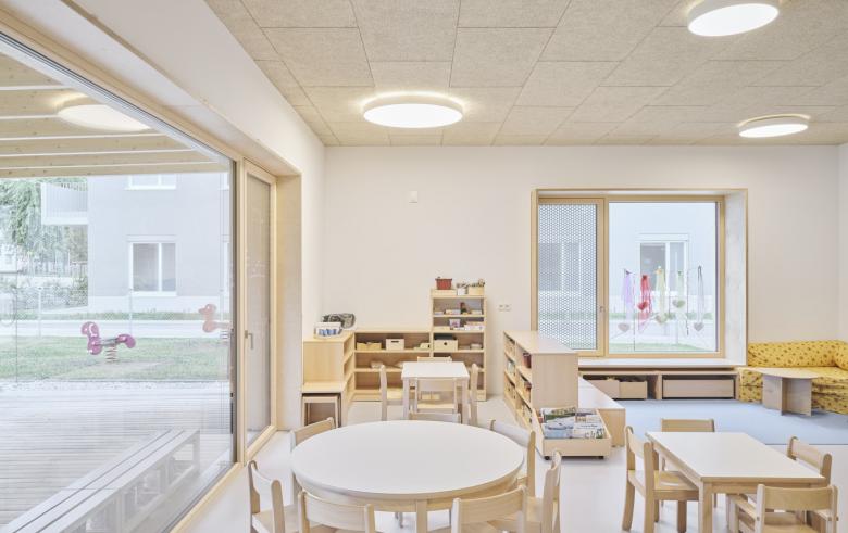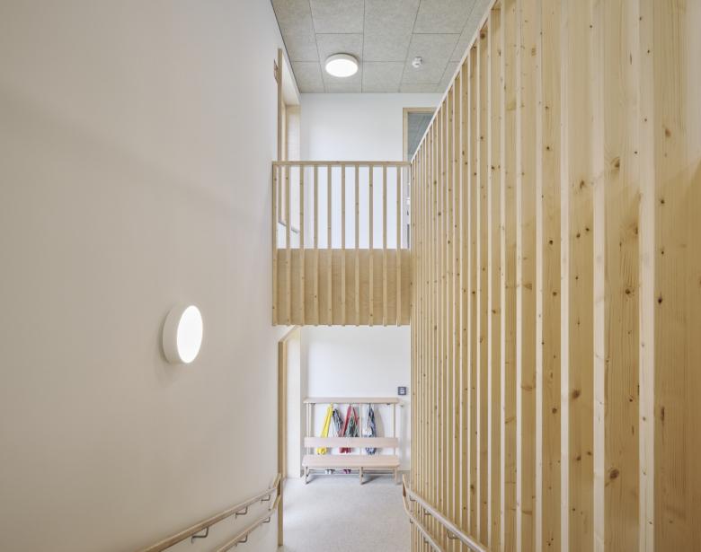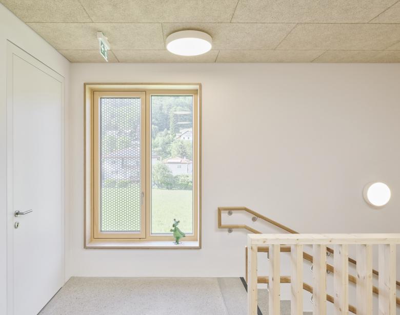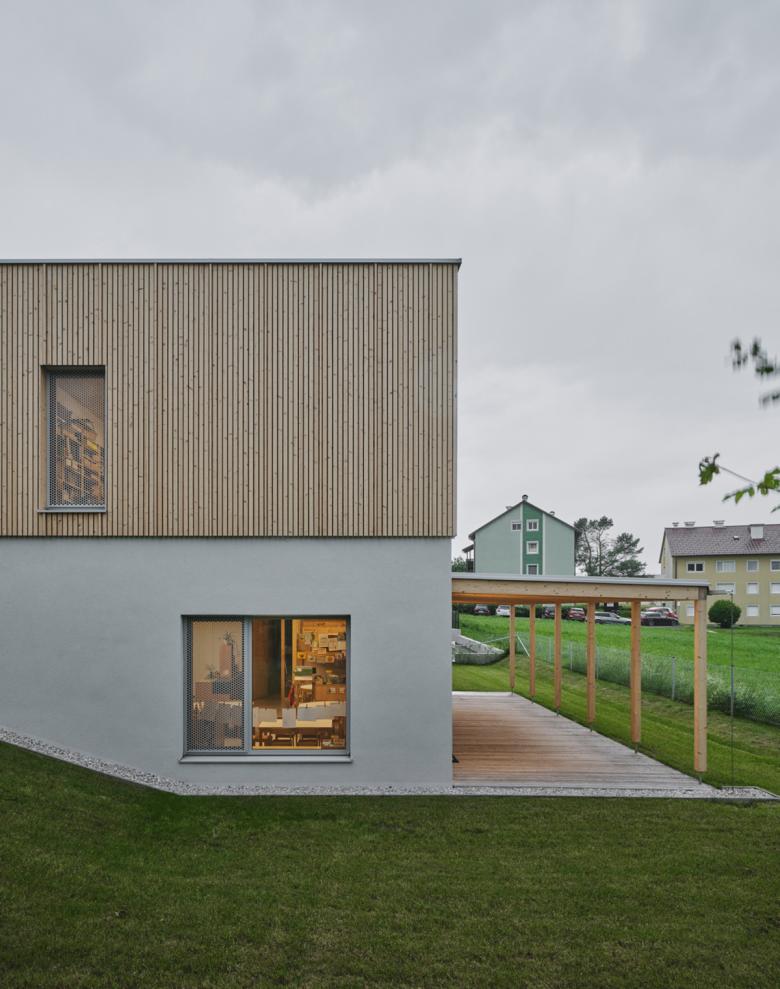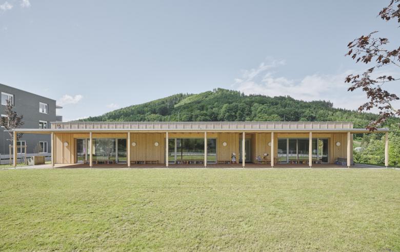 Der zur Zufahrtsstraße eingeschossig-wirkende Kindergarten mit rhythmisierter Holzfassade beheimatet 75 Kinder in 3 Gruppen und bietet ausreichend Spielfläche mit Nutzung des Hanggrundstückes als Rodelbahn. Die notwendige Aufstockung auf 4 Gruppen wird vorgesehen und kann bei Bedarf als drittes Geschoss aufgestockt werden.