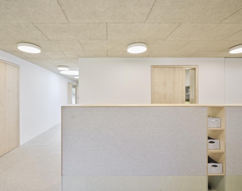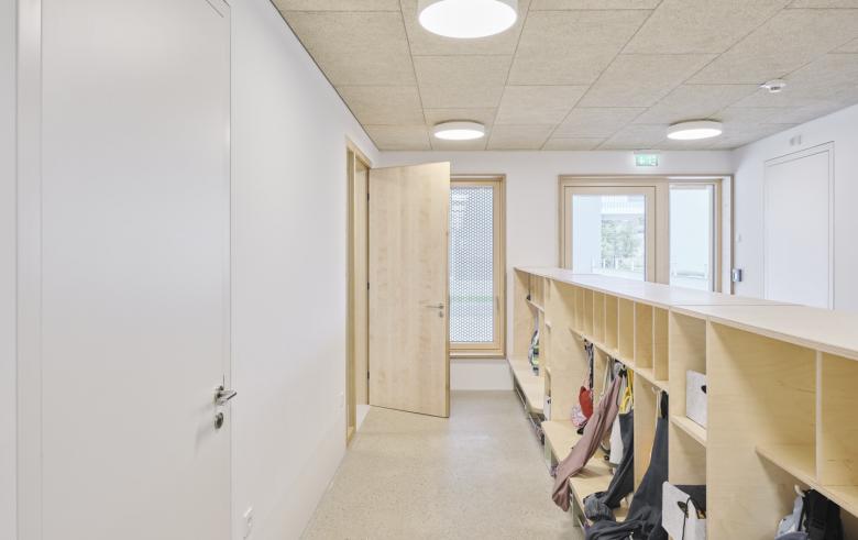 Jede Gruppe erhält eine zweiseitige Belichtung, der Bewegungsraum wird mittig eingestellt. Die Eingangssituation wird über eine großzügige mit frei eingestellter Garderobe als durchlaufende Achse ausgebildet.