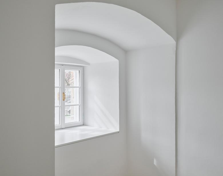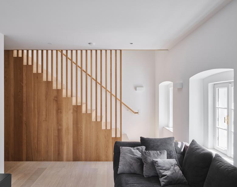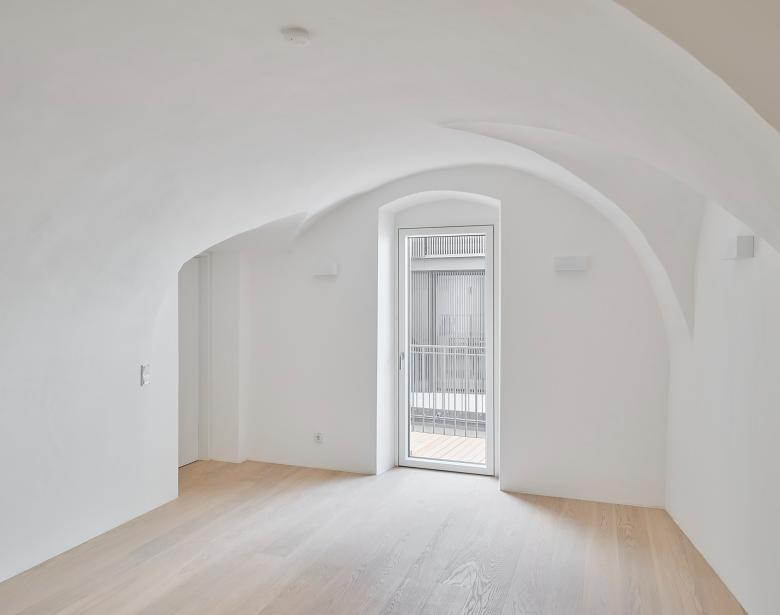 Der Zugang zum Altstadthaus erfolgt weiterhin vom Stadtplatz, wobei der historische Eingang wieder aktiviert wird. Ein zentraler, lichtdurchfluteter Flur bildet die innere Erschließungsachse des Hauses. Entlang dieses Flurs liegt das neue Stiegenhaus mit Lift, das die vertikale Erschließung übernimmt. Der Weg führt weiter in den Hof und verbindet über eine Nebenraumzone im Erdgeschoss des neuen Hofhauses den zweiten Zugang – das bestehende Tor in der Stadtmauer.