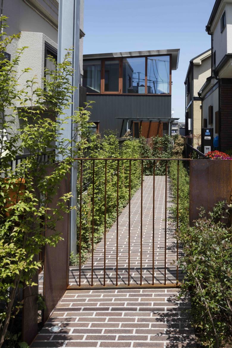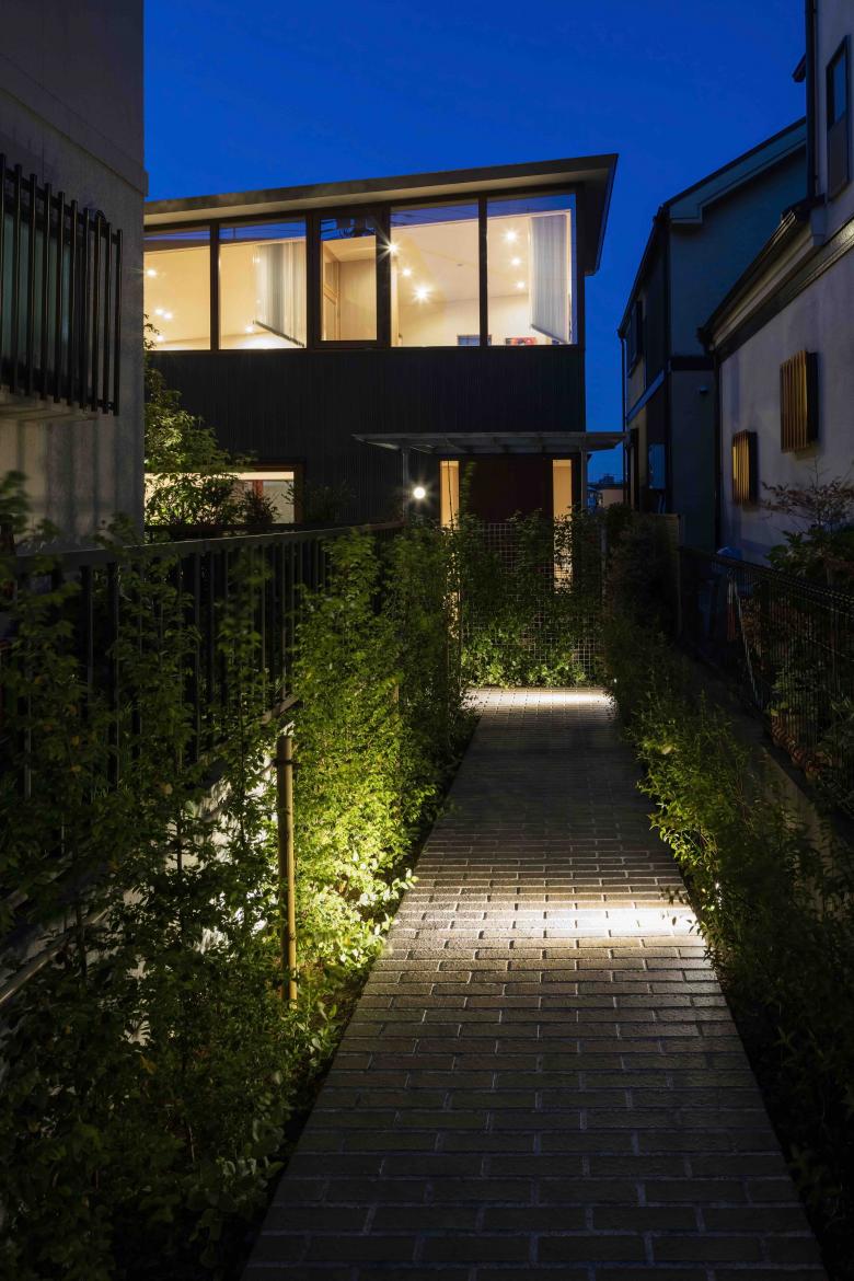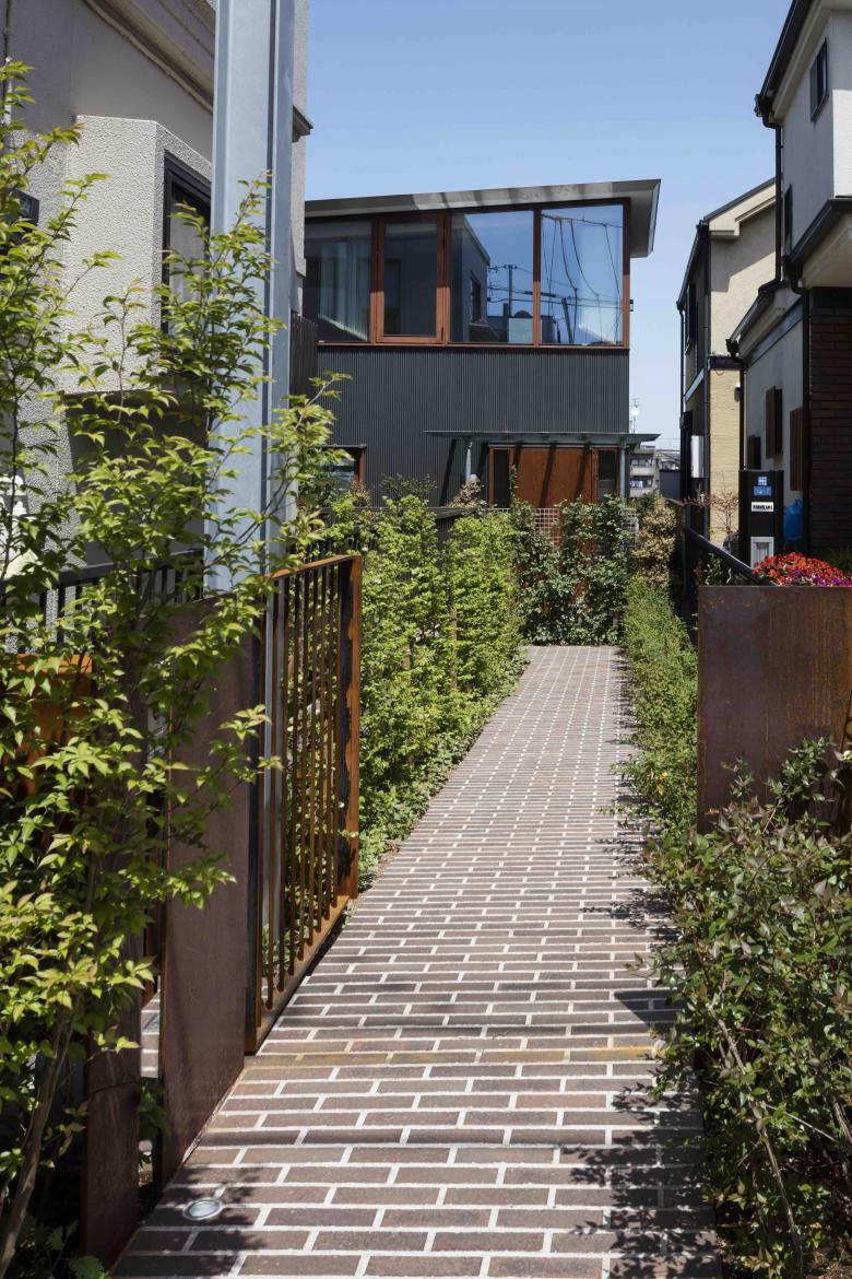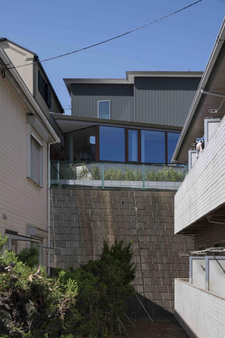 The site, located on high ground on a ridge in the Nishimagome area, has a flagpole shape, with a 2m wide by 10m deep approach descending slightly to the east from the public road on the west side, with the neighbouring land on the east side of the trapezoidal shaped site approximately 5.5m below. Planning began with a view to the distance over the roof of the neighbouring property and to make the most of the openness of the environment on the approach look-back.