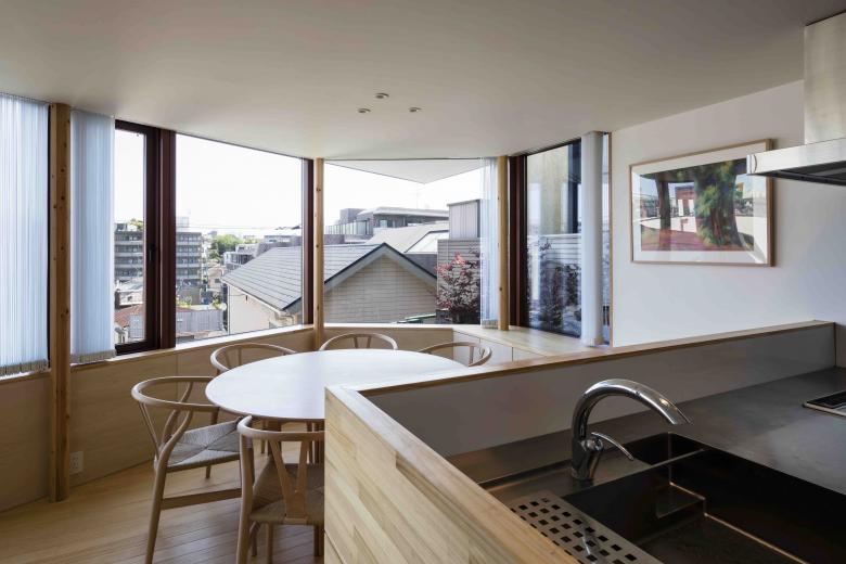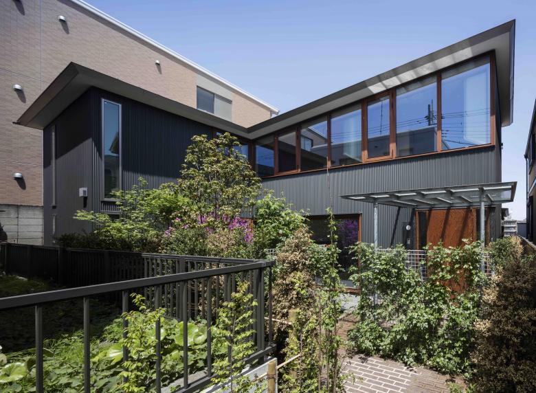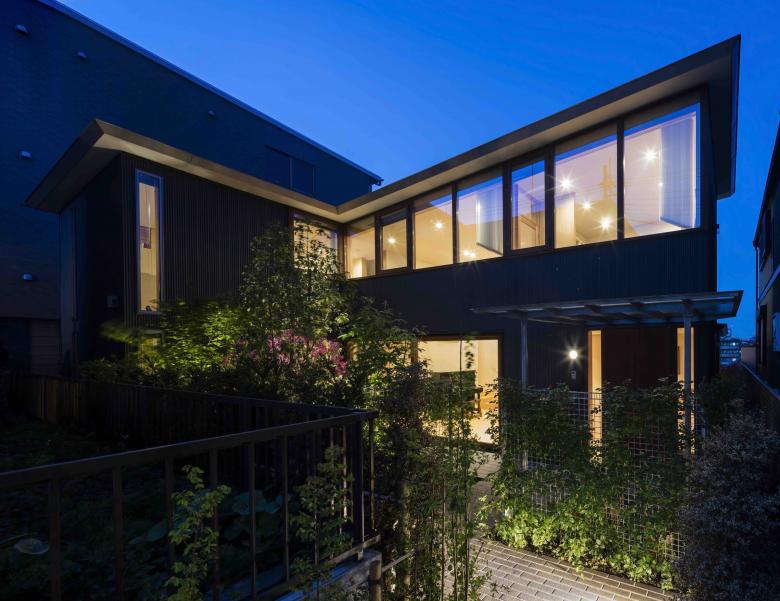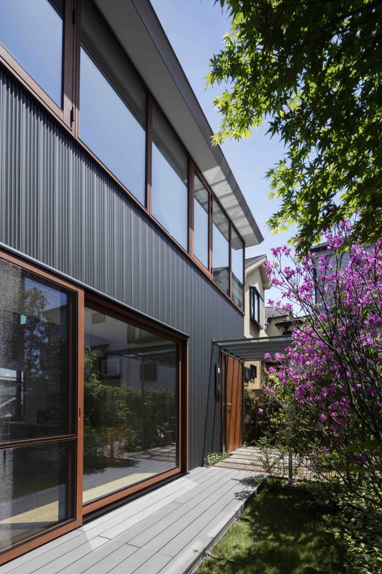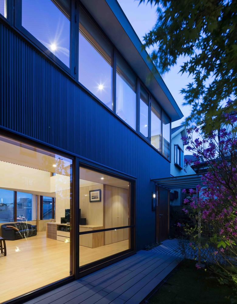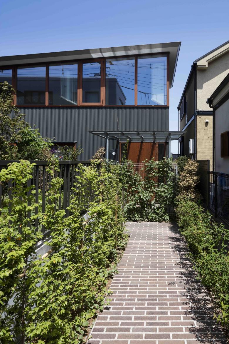 The site, located on high ground on a ridge in the Nishimagome area, has a flagpole shape, with a 2m wide by 10m deep approach descending slightly to the east from the public road on the west side, with the neighbouring land on the east side of the trapezoidal shaped site approximately 5.5m below. Planning began with a view to the distance over the roof of the neighbouring property and to make the most of the openness of the environment on the approach look-back.