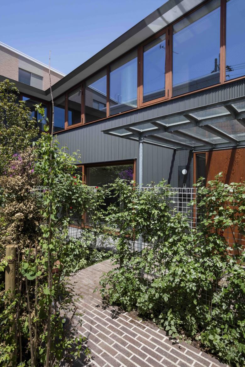 Outside, each area has its own character, with small Corten steel gates, an approach with white and yellow flowers, rose aisles, a porch with glass eaves, a garden on the west side with evergreen and deciduous trees, and a hedge of shrubs and red flowers on the east side, all of which relate to the interior of the building in various ways.