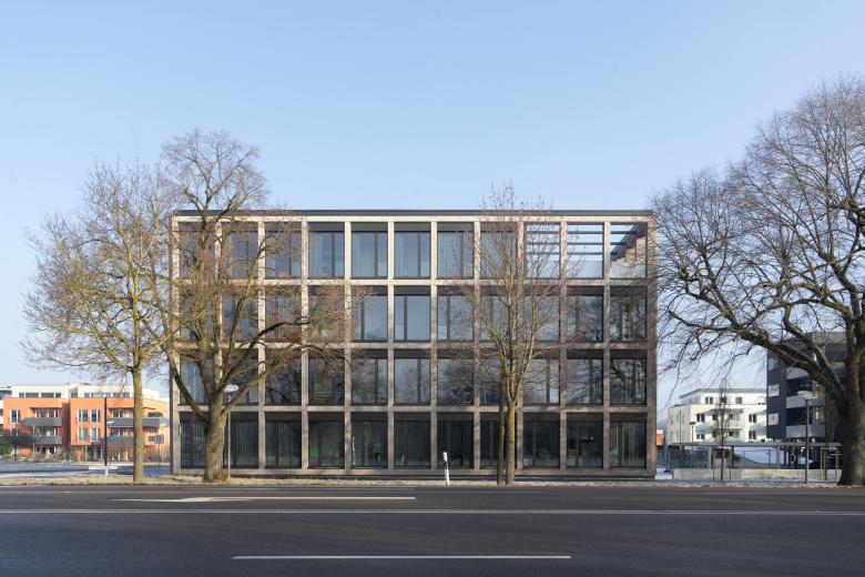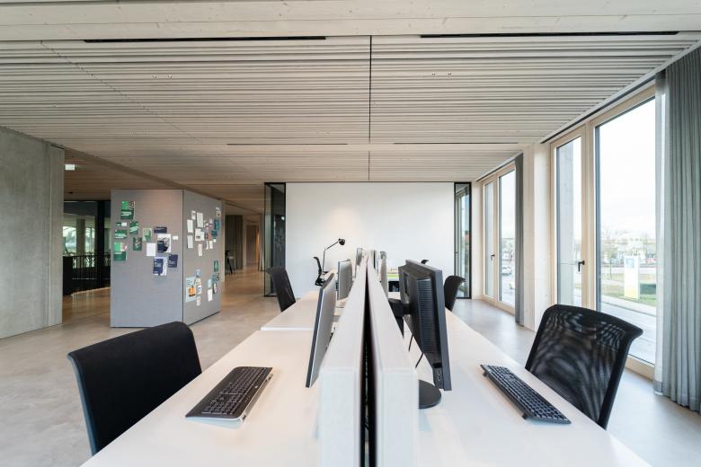 For the construction, Nething opted for a timber-hybrid construction method in which each building material was used according to its strengths: A reinforced concrete core houses the emergency staircase and elevator, while the north and south wings (where the workspaces are located) were built using timber construction. The façade made of greyed wood gives the building a lively, warm appearance.