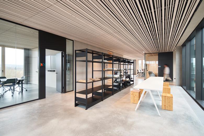 The ceiling construction, which visually connects all four levels, is particularly impressive. The material concept of wood and concrete is complemented by natural materials. Each floor has its own color concept - from light mauve to cobalt blue and petrol to dark yellow - giving it an unmistakable identity, with the color intensity following the intensity of use.