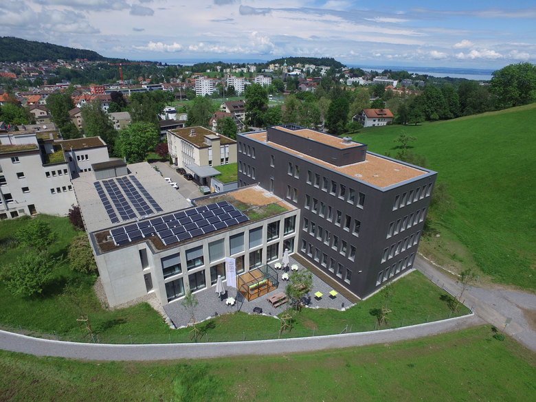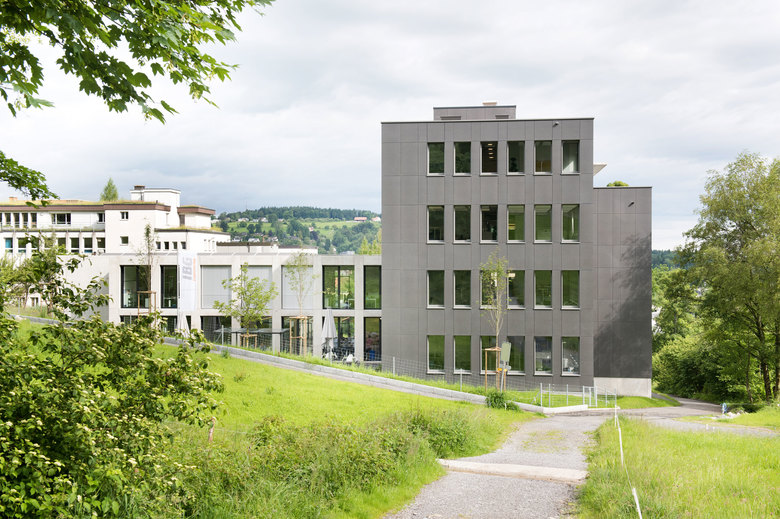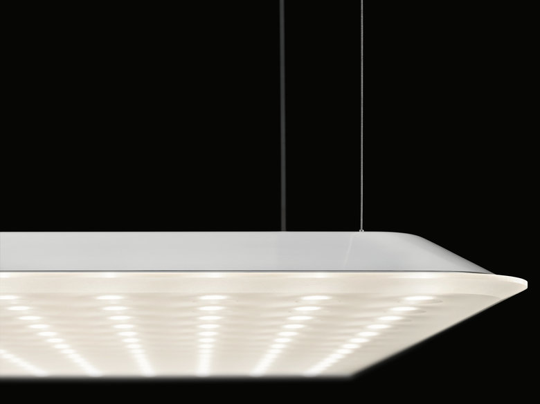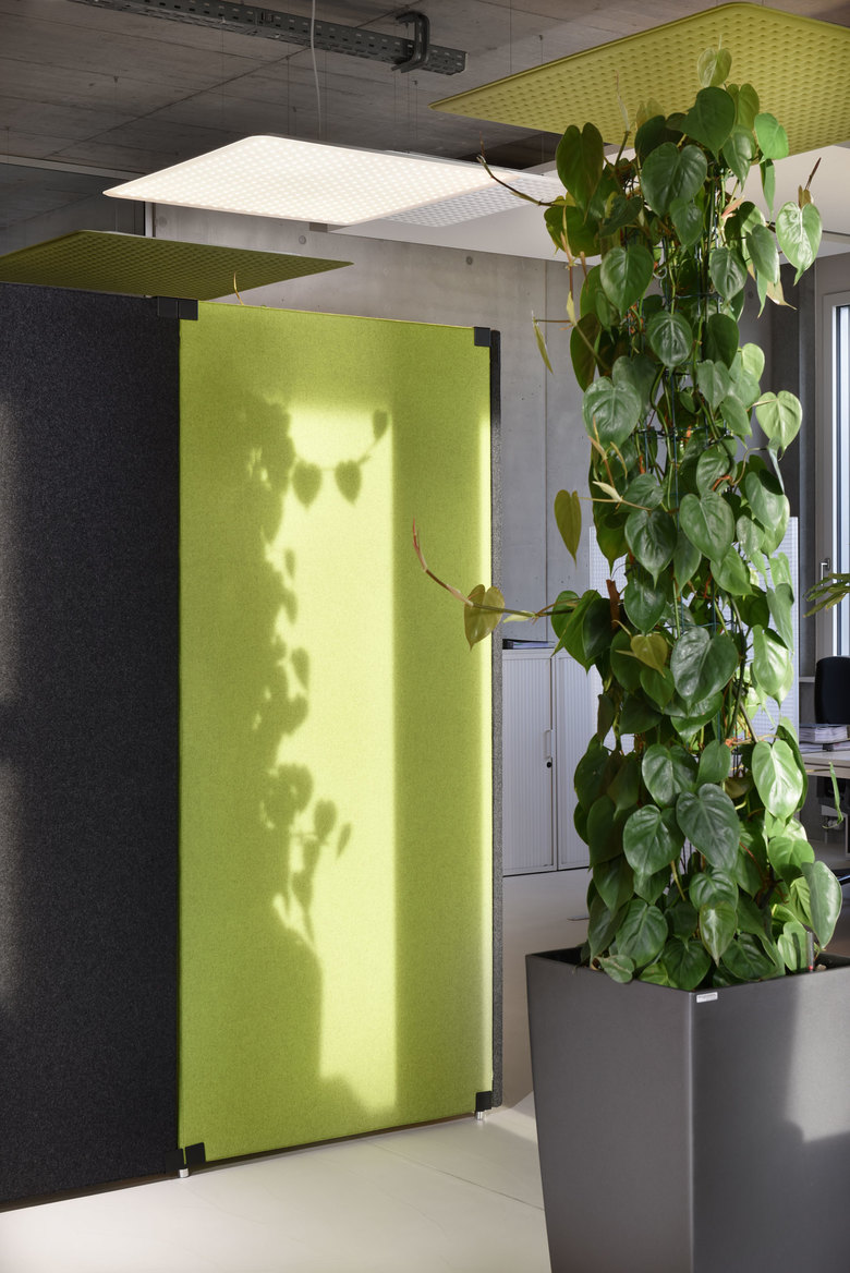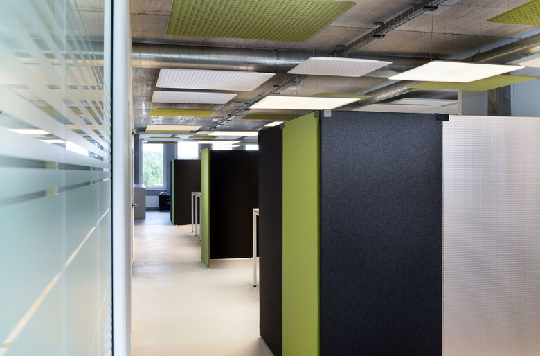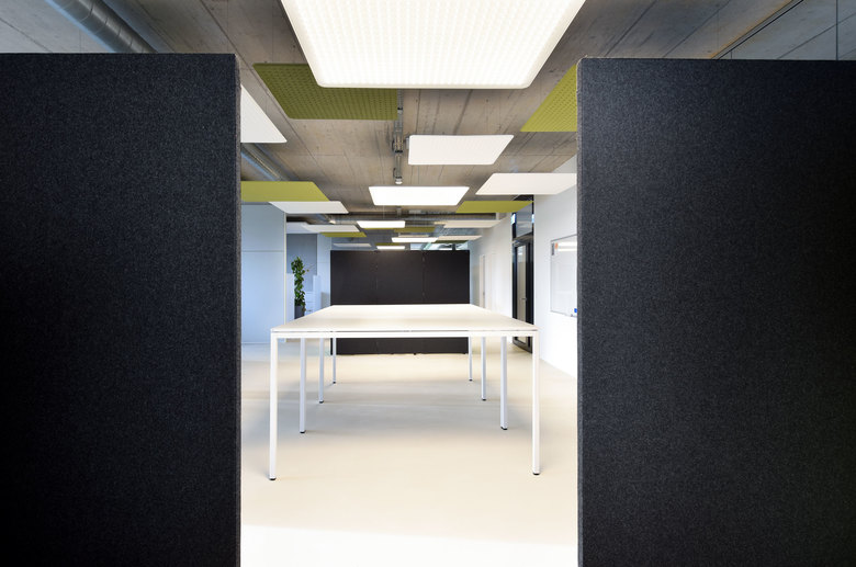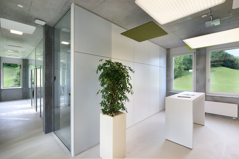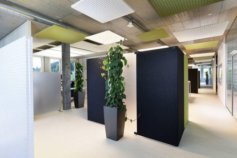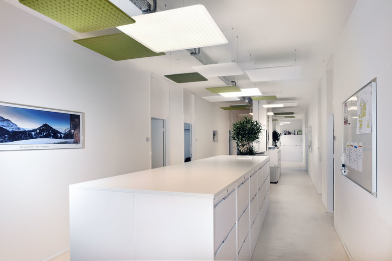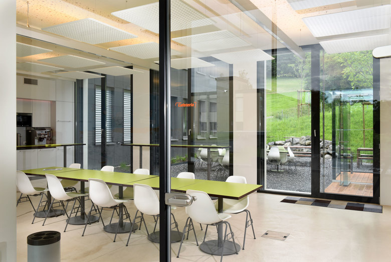 IBG B. Graf AG Engineering, a leading engineering office, specialising among other things in energy and building technology, opted for LED luminaires and Rossoacoustic solutions from the Nimbus Group with its two brands Nimbus (lighting) and Rosso (acoustics). It was the visual and functional compatibility of the two product ranges that really convinced those in charge. In the assessment of Jürgen Staud of RLC Architekten AG, the building concept of the straightforward "New East Building" stands out due to the balance between proportions, materials, utility and economy. Despite the abundance of daylight, economical LED luminaires were required, especially for the communal and circulation zones. Furthermore, effective acoustics solution were needed to compensate for the hard surfaces. The Nimbus and Rosso products used in the project "conform to the architectural functionality while also displaying a design impulse that does the building good" says the architect Jürgen Staud. The exposed concrete ceiling is brought to life by the square Modul Q Project suspended LED luminaires and Rossoacoustic PADs of the same shape. Suspended at varying heights, green PADs alternate with white and are interspersed by the extremely slim suspended LED luminaires – a playful contrast to the largely "cool" work zones. Other Rossoacoustic systems have also been deployed at IBG, where they support the versatility of utilisation intended by the architects: the semi-transparent CP30 system panels afford the individual workplaces more privacy while allowing spontaneous changes to a room's layout thanks to their low weight. Although just as lightweight, the TP30 Wool acoustic panels have been fixed in position and form practical cubicles for accommodating coats, photocopiers and stationery. The convincing solution in the new building seems to have had a contagious effect: the client decided to completely rejuvenate one corridor in the main building from the 1970s and also had it fitted out with Modul Q luminaires and acoustic PADs. The result is a lighter, more friendly and, in terms of acoustics, much more pleasant working atmosphere. The cafeteria is housed in the structure linking the two buildings. Eighteen PADs were also installed on the ceiling here to enhance the room's acoustics.