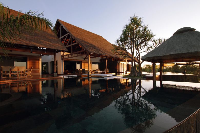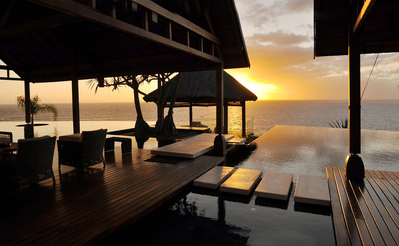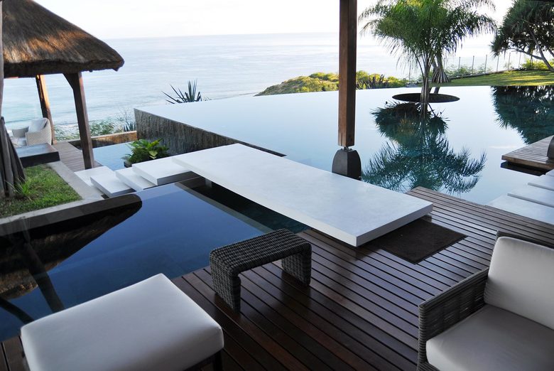 On the west side the site provided a cliff edge view of the vast Indian ocean, and on the east side a more protected view from under the shade of the palm trees towards the green slope of the island's indigenous countryside. The concept aimed to naturally merge these complimentary elements : The west sea-facing side would be vast, majestic and entirely on the water, blending into the ever-changing elements with the noise of the ocean, whereas the east side would be green, calm and relaxing… almost meditational.