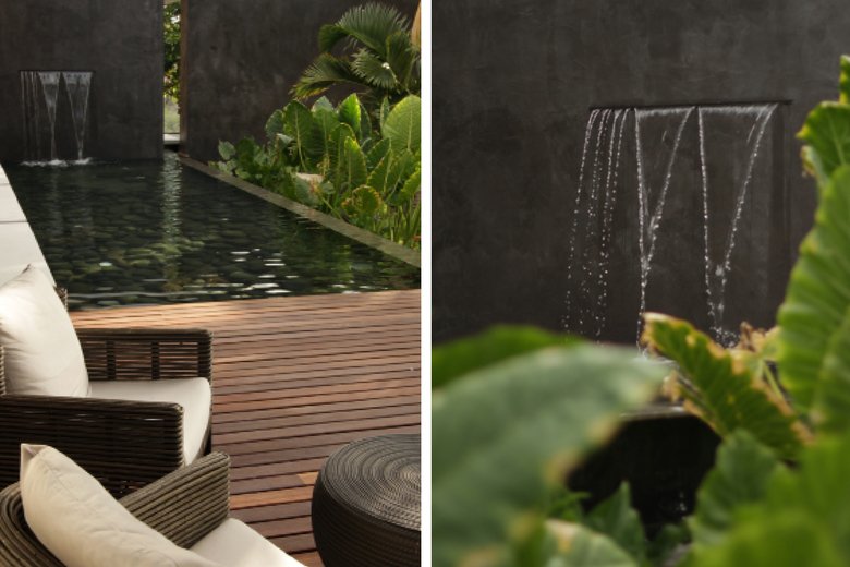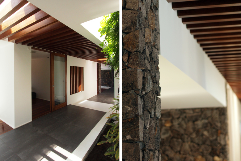 The west perimeter of the house is dominated by a 50m infinity pool that follows the contours of the cliff and overflows into the breathtaking 180 degree panoramic view of the ocean. Separating the west side with the lush east side is a central 40m axis with open-ended views to the north and south and from which the interior spaces of the home branch out and flow. For a house of such magnitude, the design succeeds in seamlessly linking the contrasting environments of the east and the west. The discreet inclusion of tropical textures within the modern interior maintains a warmth which coupled with ponds, gardens, green walls and the sunrise and sunset each day, brings to life an environment that is both intimate and contemporary.