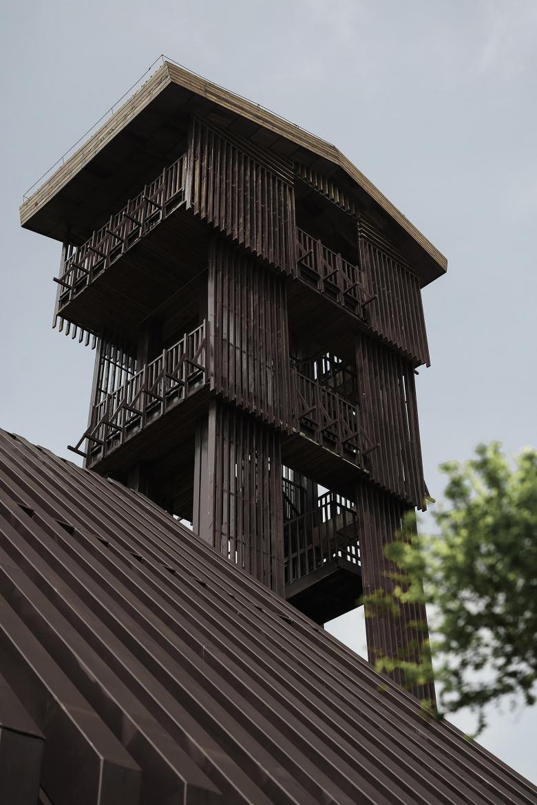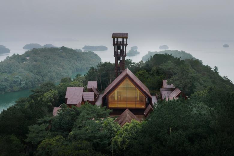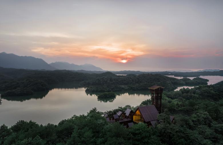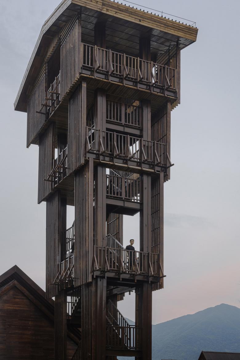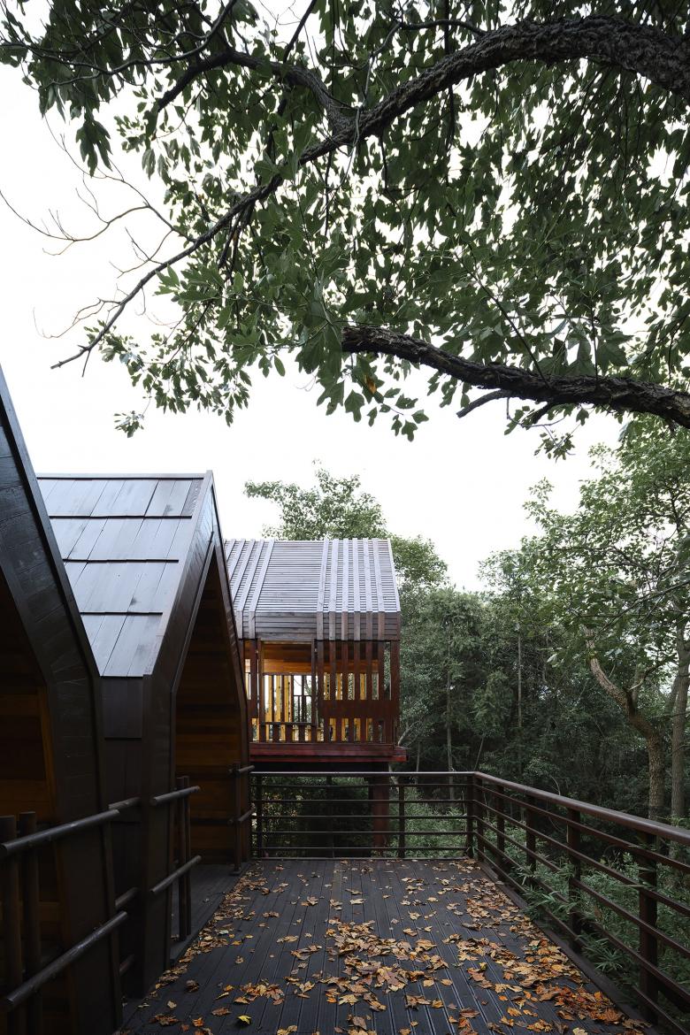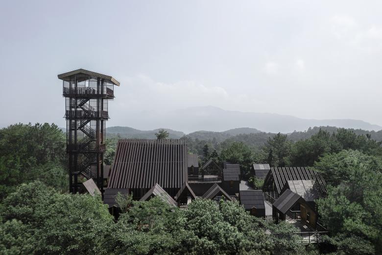 The Wooden Cabin Town is located on an island in the West Sea of Lushan, southwest of Jiujiang, Jiangxi. It was designed by Shanghai Parallect Architecture Studio. The predecessor of this water area is Xiu River, one of the five major rivers in Jiangxi. From the 1950s to the 1970s, the Xihai Barrage, known as Asia's largest dam, was built here, and it formed a unique island in the lake area: like clusters of jungle floating above the water. And what we hope to present is a cluster of small wooden cabins floating above the jungle.The design includes a 24-meter-high observation tower, a multi-functional hall, and 19 prefabricated forest wooden cabins.The fusion gesture between the building and the lush natural cork oak forest on the island is the starting point of the project. Therefore, as the core part of space upgrade project of the island, new building is constructed entirely on the basis of the demolition of the old building. The integrated design makes it easier for the wooden cabin to be transported to the island for assembly. The wooden cabin is elevated by an independent foundation, and the ground is repaired and restored. The waste from the demolition of old buildings is also buried in situ as much as possible to become the foundation of the multi-functionalhall.The design of masterplan owes much to the site and nature rather than the architect: the surrounding trees determine the boundaries of the building. The rules of core space and edge expansion are made: the axis of new buildings is set in the core area of the original architecture, and buildings are filled in the blank area among trees.Compared with the rigid rules and rigor, we hope to introduce more bottom-up adaptability and spontaneity in this project which chases the wild fun of the jungle.Thanks to such natural endowments and design strategies, the final proposal is breathing: 3 types of cabin modules are embedded in the site, and the platform presents a rhythm of different heights to adapt to the terrain. The orientation and openings of the wooden cabins are carefully arranged to make them a viewing frame for each other. The main material of the cabin is Hongxue pine wood with insect-proof and anti-corrosion treatment, which still exposes the original wooden texture. We don't even want this place to look like a clean and tidy new building, but rather an intimate dialogue between