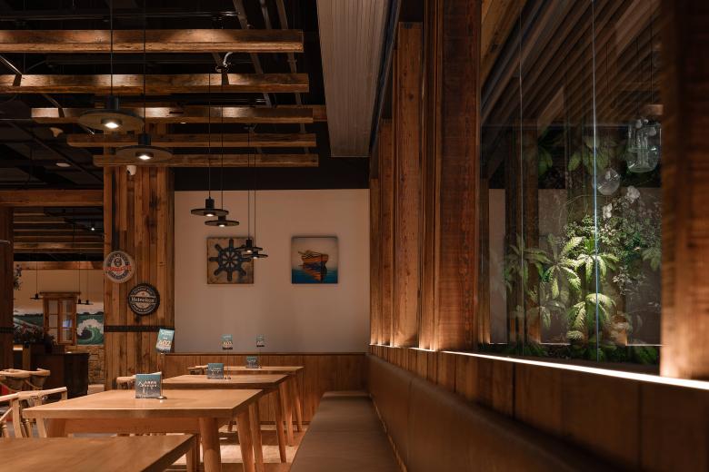 In this project, the bar, serving as the visual anchor and functional hub of the space, is positioned at the intersection of the restaurant's main axes. The design employs a monolithic dark oak panel with a matte finish, preserving the natural wood texture and hand-sanded traces to evoke a rustic and 沉稳 (stable) "ship 舷 (hull)" aesthetic. The bar's facade uses recycled wooden planks spliced in staggered joints, forming a structural language akin to the waterproof planking of fishing boats, thereby enhancing the narrative atmosphere within the "wharf" contextual framework.