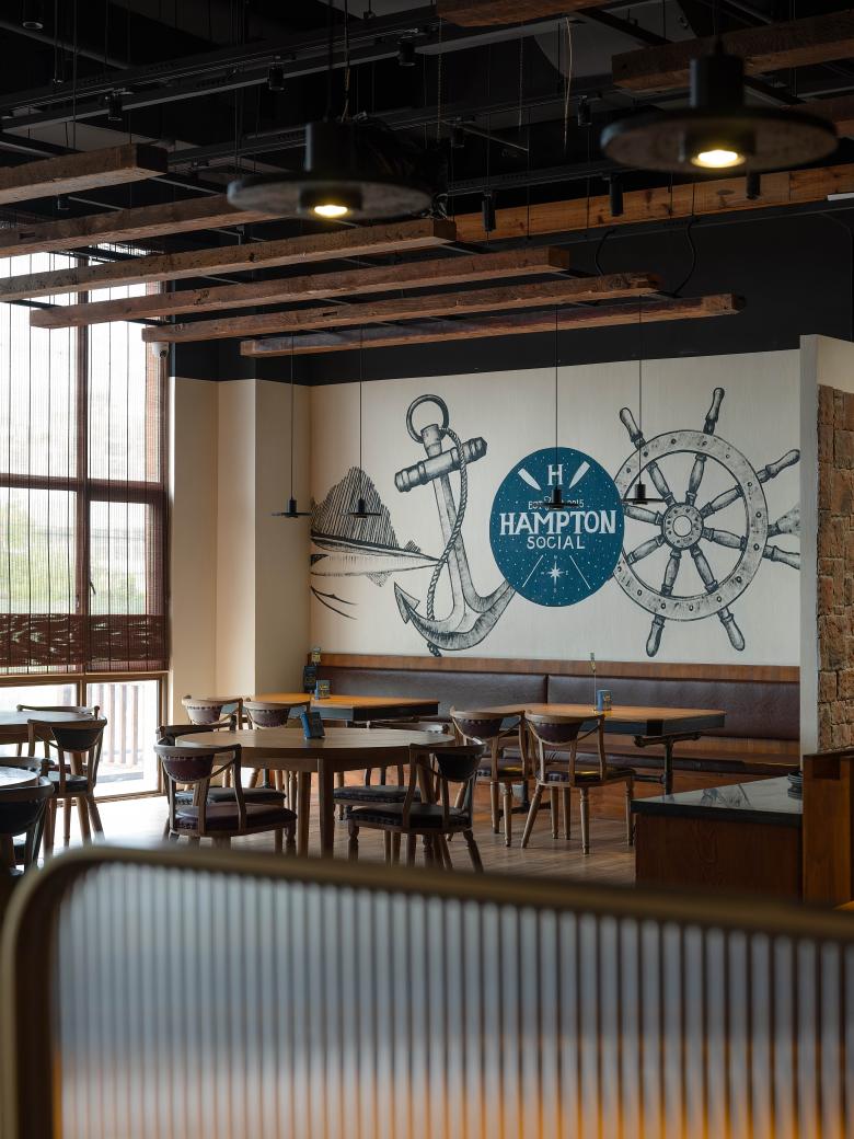 In the transition wall between the main dining room and the private room, the designer introduces a hand-painted mural based on the element of ‘waves’, depicting the dynamic imagery of tidal waves with abstract brushstrokes, injecting a touch of free and dynamic visual rhythm into the overall wooden space.