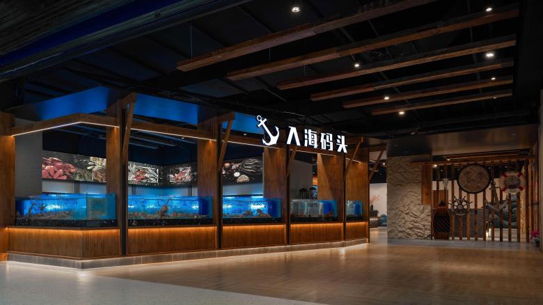 The seafood display area is located between the entrance of the restaurant and the main hall, which is the key node connecting the external market atmosphere and the internal dining experience. The design is based on the logic of the ‘dock to shore’ dynamic line to create a visual focus, and the entire surface of the customised blue aquarium glass fish tanks, forming a sense of experience similar to the ‘ready-to-eat’ seafood experience in the coastal fishing market.