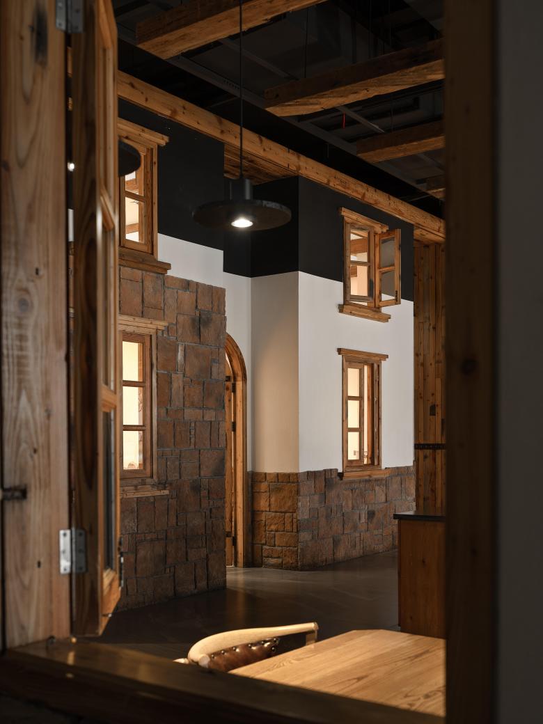 The core language of the interior space is ‘wood’, using a lot of recycled wood, dark-coloured solid wood panels, and old beams refurbished components to form the roof, partition walls and card seating interfaces, which gives the place a sense of warm texture and visual continuity. The walls are clad with local stone and plaster texture paint, presenting a low-lustre texture close to the roughness of the reef surface, which collides with the wood materials to form a cold and warm collision.