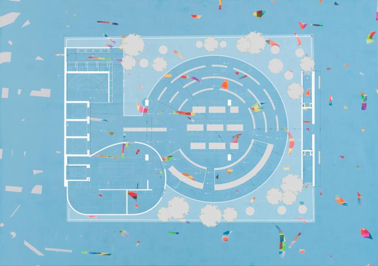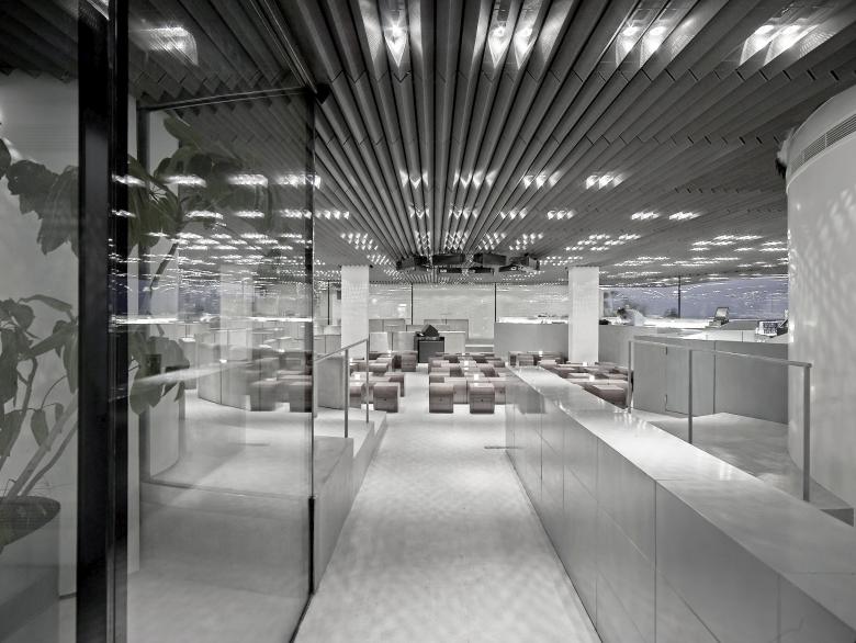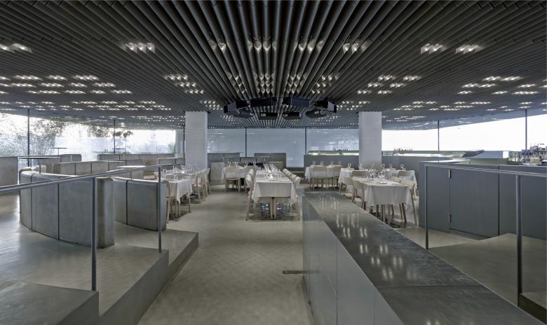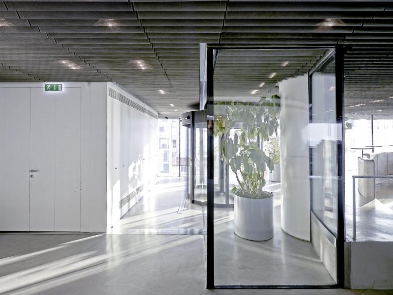 The terrace "wrapping" the rounded glass volume celebrates the two opposite conditions of the crowded urbanity and the stretched wide horizon while creating ambiguous relations with the inside: