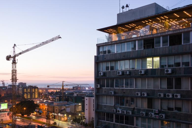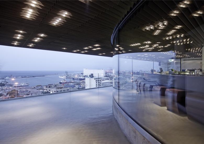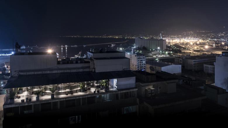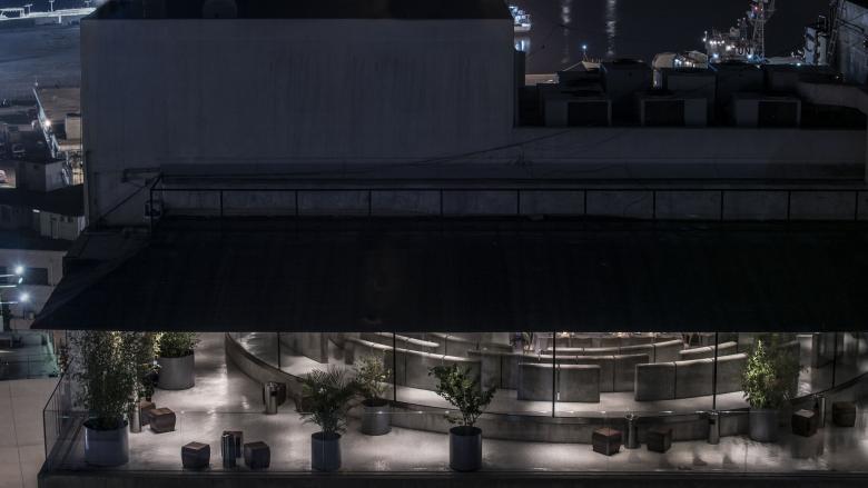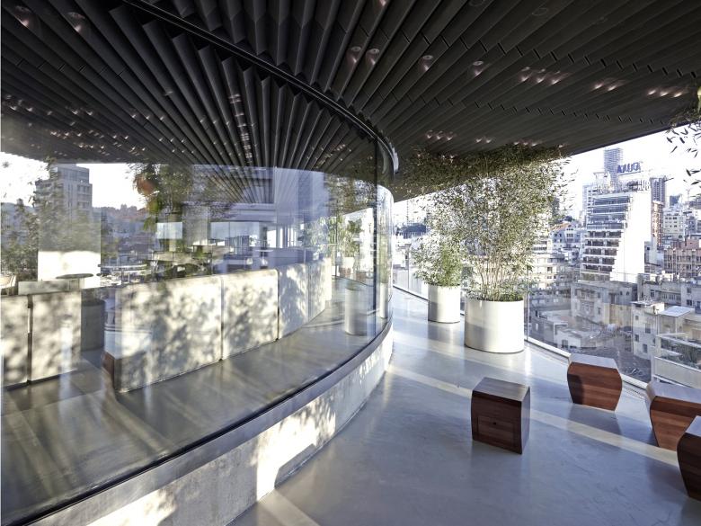 The restaurant bar is a simple glass pavilion on the last floor of an office building on Pasteur Street in Beirut. It enjoys views on the city from one city and the Mediterranean sea with Beirut’s Port from the other.