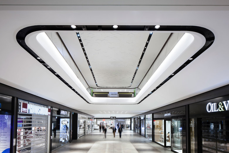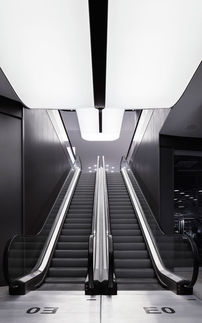 The black channels correspond with the black escalator's handrails and the dividing gaps under the escalators (which are key lighting objects all around the space); with the dark grey profiles of the shop facades. All this is the result of a carefully considered three-dimensional concept, very graphical, with strong contrasts, created in close co-operation between the interior architects and lighting designers.