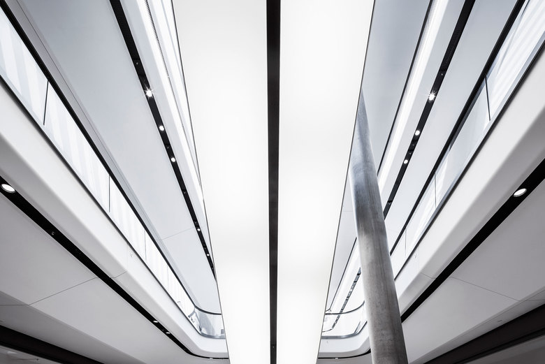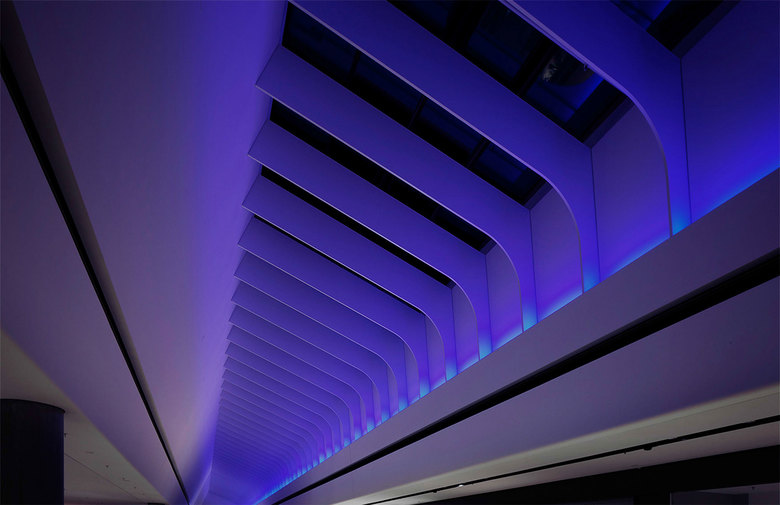 Above the top floor, a huge sky light allows the daylight to illuminate the enormous space. In order to hide the frames, the interior architects designed a system of white baffles. At night, a blue LED strip transforms the skylight into a magic lighting object.