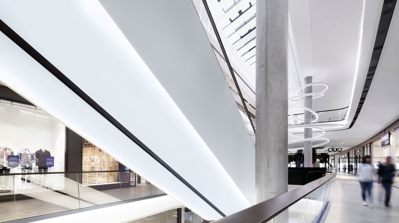 At Gerber Mall, lightness, clarity, sophisticated minimalism are the well-balanced tunes for the interior design, hand in hand with the lighting design. How to minimize the visual weight of a 1 mtr high ceiling package, filled with a/c ducts and all other necessary technical features? Illuminate the white flanks of the generous ceiling openings, glare-free, easy and just cool.