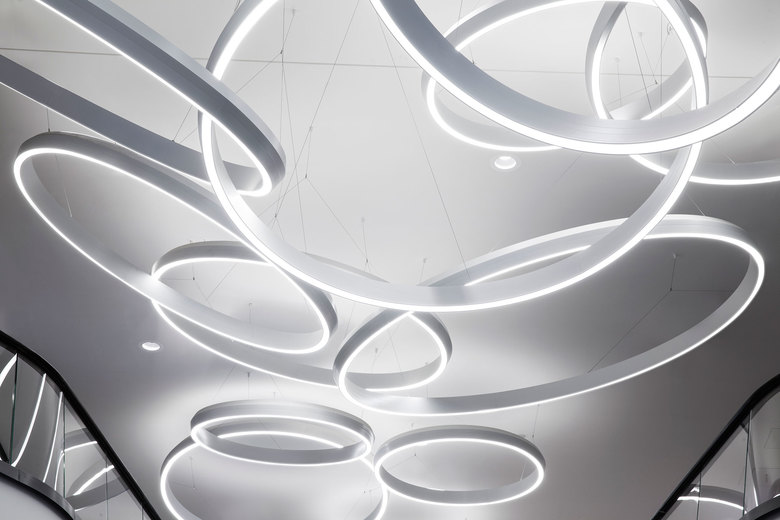 With three entrances situated on two levels, the Mall reflects its complex urban situation and neighborhood. In the light of a corporate design theme for all entrance areas, the total amount of 31 LED rings have been designed especially for the project. In the basement, the rings are integrated in the ceiling, in the other entrances they are freely suspended from the high ceilings. Their counterpart, a "hoola-hoop" object of 10 rings, and the only one with a RGB system for special events, circles around a central column, being reflected in the fountain below and moving up over the total height of all three shopping floors.