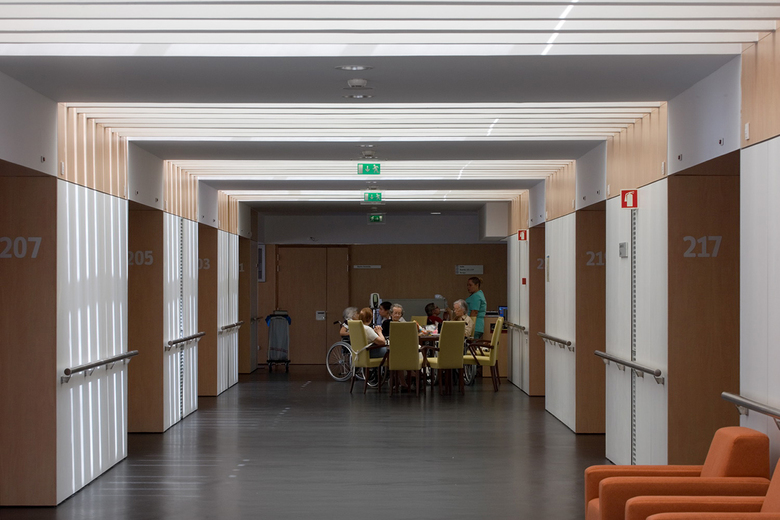 The Hospital Residencial do Mar is located a few hundred meters from the Tagus River, in a residential urban area on the outskirts of Lisbon. On the site, there is a Portuguese modernist building that housed the old Estação Agronómica Nacional that we partially rehabilitated, and attached a new contrasting wing in the form of an inverted G.