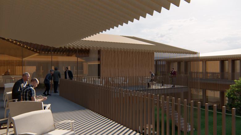 Blending into its low-rise residential surroundings, the design creates a village-like layout of small buildings and shared courtyards. At its heart is a central plaza with access to a day centre, encouraging strong connections with the local community. A multi-story building above the day centre will house self-sufficient senior apartments.