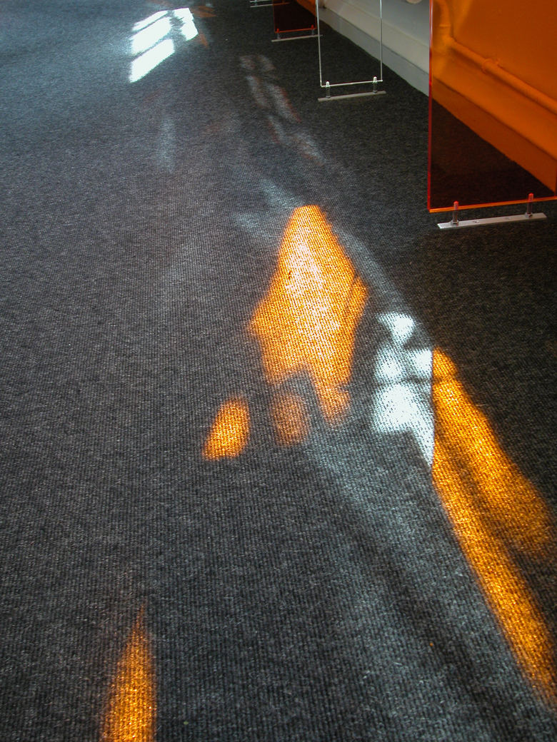 The action of walking up the stairs thus corresponds to physically entering the display. The shape and material of the elements have been chosen to abstract the experience from possible semantic interpretations, but, at the same time, induce an excess of ephemeral visual conditions.