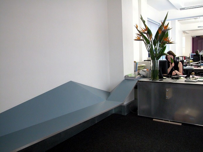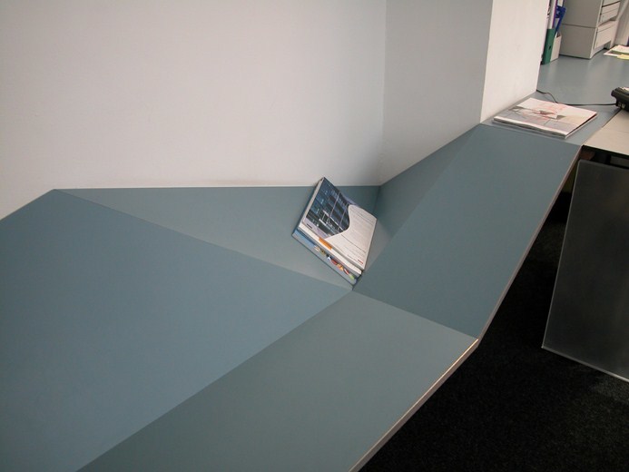 A room-long workbench provides a backbone for a series of workstations. At one end it folds down to form visitor seating. This intention to unify the worksphere with the reception of visitors is further enhanced by carrying the overall aesthetic to the reception desk.