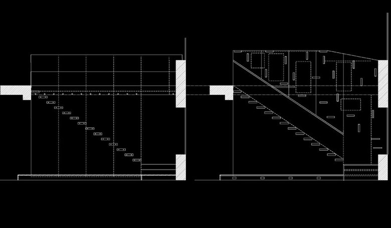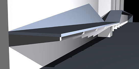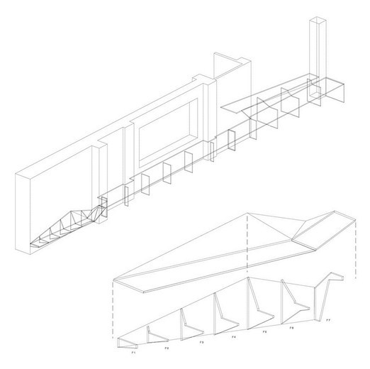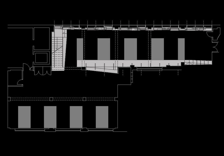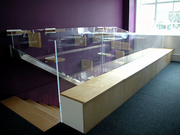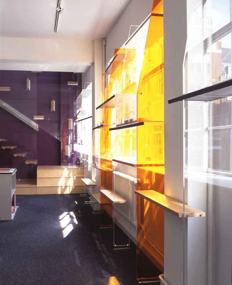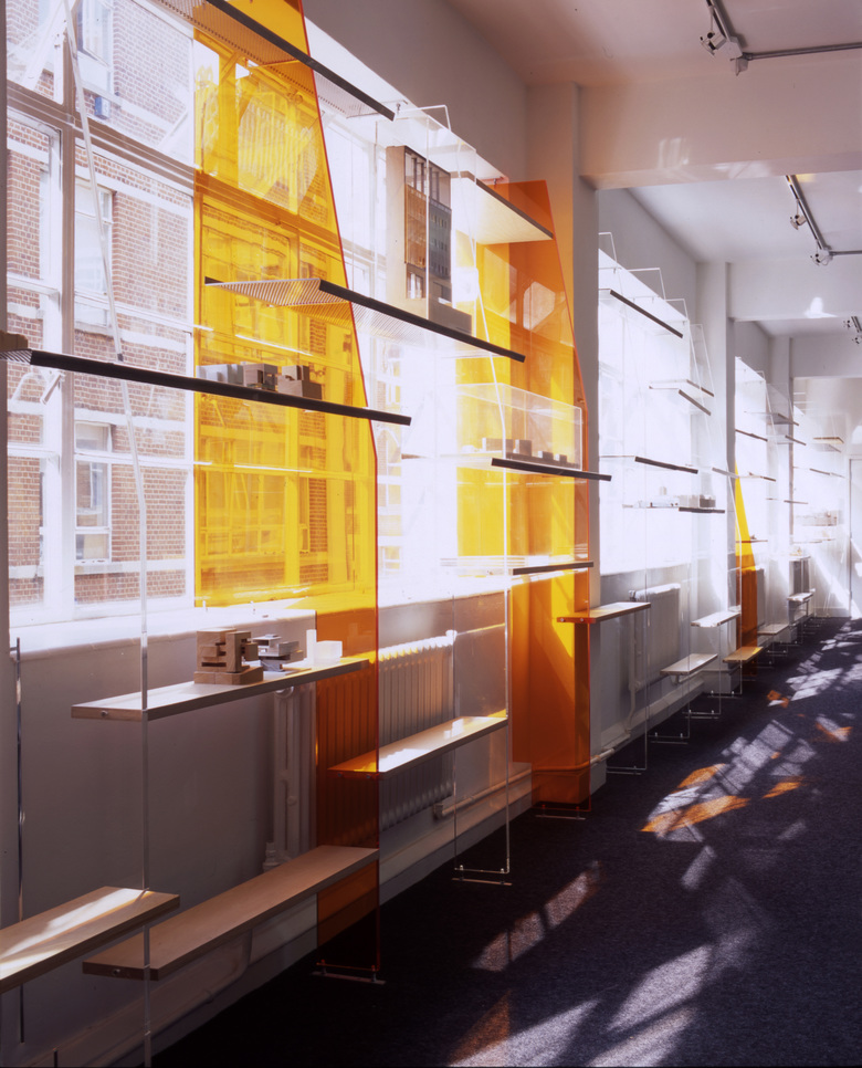 An extensive display system made from a series of perspex risers highlights the structural modular of the building, and projects daylight into the space in unpredictable and fluctuating ways. The risers are cut in order to reveal a continuous wedge-shaped volume that differentiates the corridor from its sides. Its shelves, made from a combination of folded perforated steel and plywood, are arranged in a school-of-fish pattern. In keeping with the riser motif, this suggests coherence amongst individuals that form a community. Carrying working and presentation models, this pattern is representative of the firm's working methods and social framework.