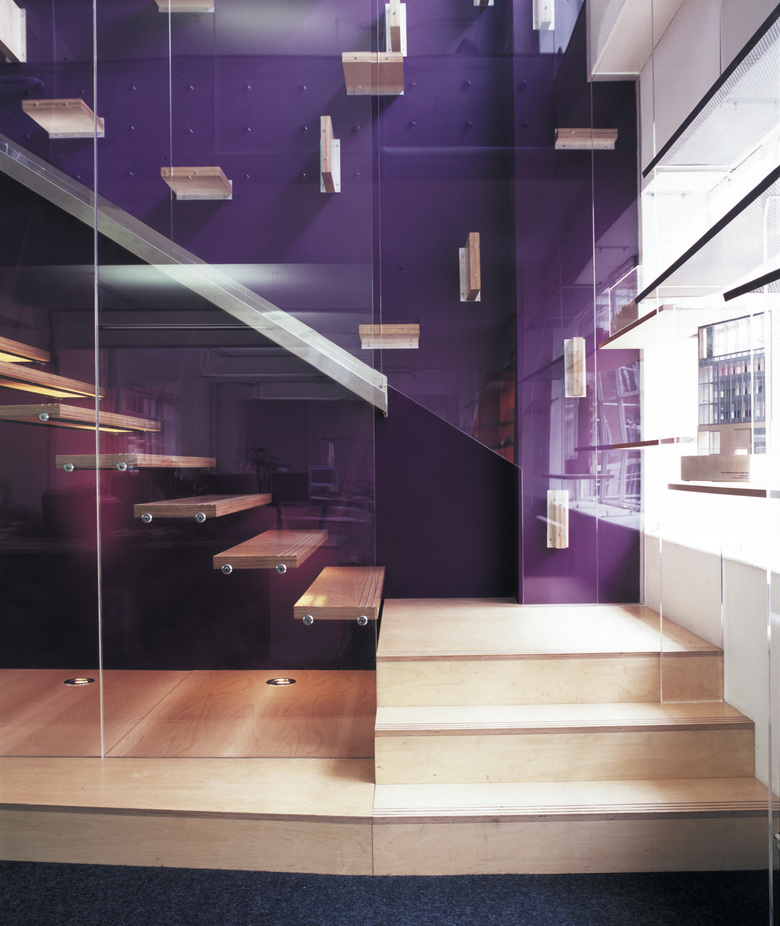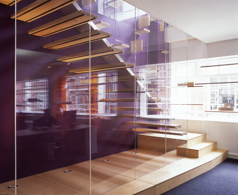 A new staircase was inserted to connect both floors of the office. Solid planks of plywood are suspended from full height perspex screens; in this way, the stair reads as an extension of the display system.