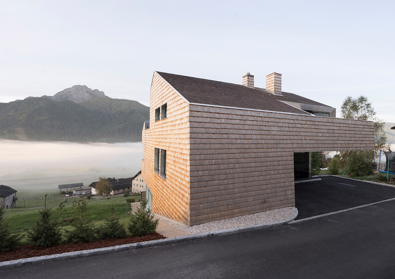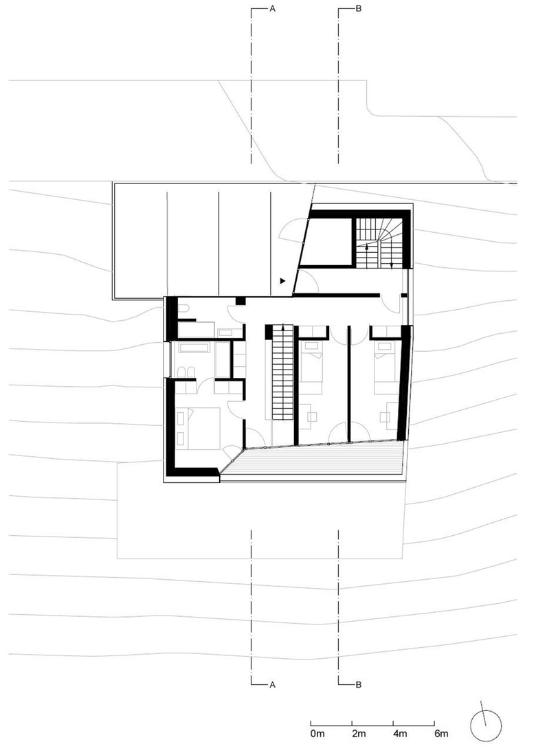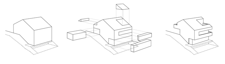 The idea of the project was developed starting from the restrictions imposed by legislation, such as minimized building surface and the requirement of a pitched roof parallel to the slope. The final volume and the concept of the whole project is the result of a subtraction process. Starting with the maximum volume (as derived from given height and surface) certain parts of the volume were substracted to create specific functions; a covered space for parking, balconies protected from the weather, and the terraces in the attic level which introduce light into the house.