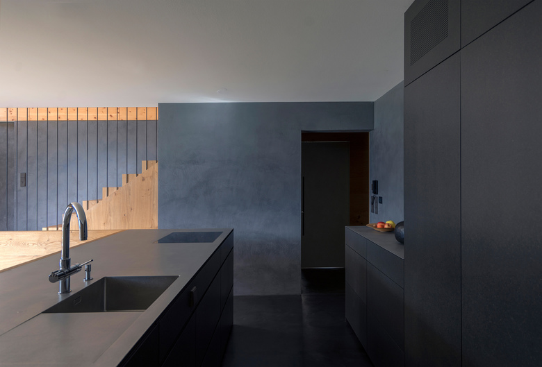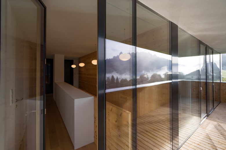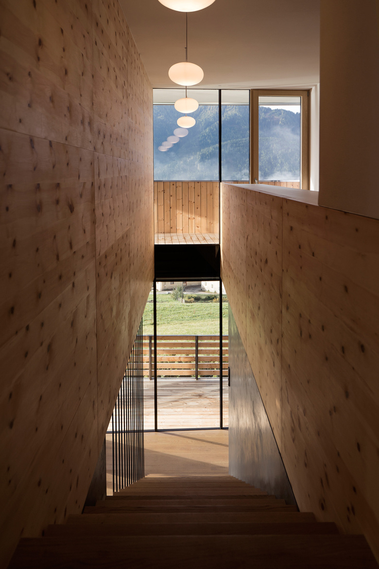 Particular attention was paid to reducing the carbon footprint of the building by employing windows with triple glazing, controlled ventilation, a heating system with pellet stove and extended insulation with wooden fibers. In the interior lime-based plaster throughout guarantees excellent acoustic performance and moisture control.