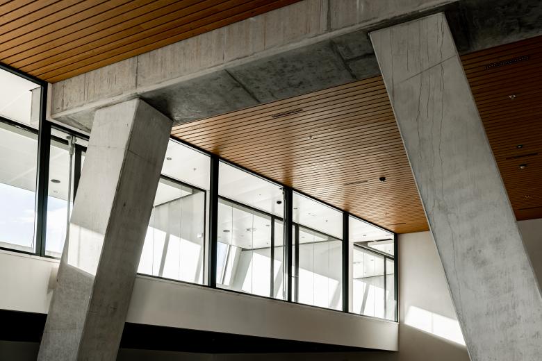 For sheer monumentality, natural stone was an obvious choice for the tower façade. This was combined with glass and wood, materials that are strongly featured in Maaskant’s design. The three materials are integrated into a lively rhythm of horizontal bands. Some of these mixed-material façade panels were hoisted aloft, which were safely done at windspeeds of less than 5 (35 kilometres per hour).