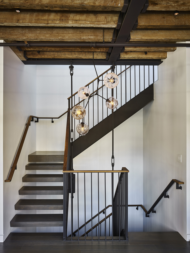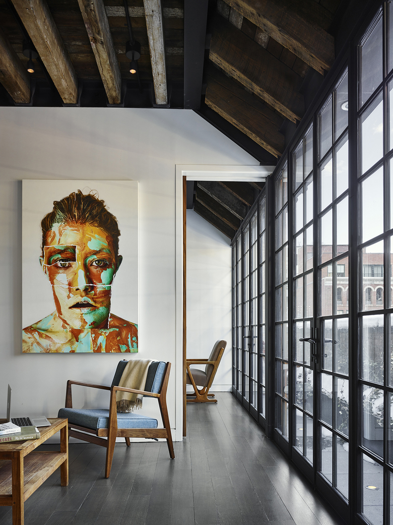 The restored facades of Hubert and Collister Street include the foliate moldings, cornices, and arched windows. A minimal color palette is used and the original characteristics are kept, but upgraded. A steel catwalk with glass floors is attached to the walls of the double-height living area and allows for a wrap-around library. The Romanesque Revival building’s original fire escape was removed and re-installed with steel fire shutters to complement the original character of the Collister street facade. Finally, the original wooden ceiling beams were restored. An addition of a 1,000 square foot rooftop penthouse is left invisible to pedestrians, respecting the historic community. This addition is clad with standing seam zinc and steel windows, wooden doors, and steel railings. 10 Hubert summarizes as a restored and conserved piece of architecture, with an unintrusive new connection to exterior urban living.