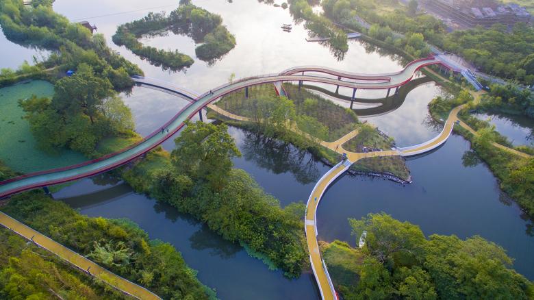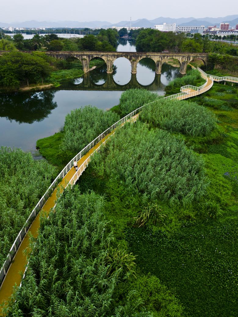 Secondly, preserving and integrating. All existing vegetation along the river, notably the Dawn Redwood (Metasequoia glyptostroboides) grove at the upper reach of the river, and the Wingnut Trees (Pterocarya stenoptera) along the middle and lower reaches of the river, are all well protected and integrated with the designed vegetation. Cultural heritages and existing structures such as bridges, aqueducts, and water locks were all well preserved and integrated with the new design of paths and platforms, so that the memory of the past can be kept.