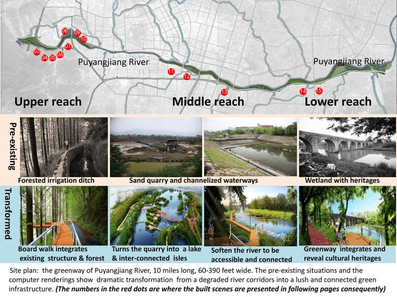 Pujiang, a small city located in East China dominated by a monsoon climate, has a population of 100,000plus another 400,000 living in its vicinity. It occupies a small and productive basin which the River Puyangjiang runs through. For almost two thousand years, the city and its agricultural vicinity lived in an Edenic paradise. Such calm and harmony has been broken by the ruthless and rapid industrialization and urbanization in the past four decades: the Puyangjiang River and its tributaries were heavily polluted, water courses were channelized, and river beds were turned into sand quarries. The river became a backyard dump and people turned back from it. The river that used to be the pride and unifying tie of the community had become foe associated with ugliness, foul smells, and danger. As a matter of fact, it was listed as the worst case in the provincial region and ended up giving the city an unfamed identity. Beginning in early 2014, the local government launched a campaign to improve the overall living environment of the city and Puyangjian River was taken as a pilot project setting up a model for the city and the provincial region as a whole. Through competition, the landscape architect was selected and commissioned to transform the degraded river corridor into a greenway, with clean water, healthy ecology, and an active corridor for daily recreational uses that connects the community and brings back the beauty and dignity of their mother river.