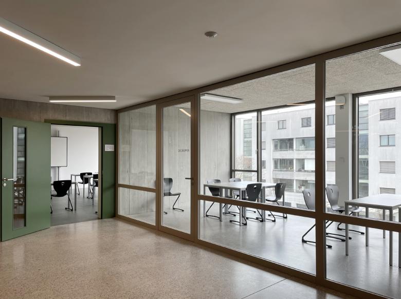 Die rechteckige Grundrissfläche der Untergeschosse variiert in der Breite und Länge von der Fläche der Obergeschosse, und die vertikalen Lasten der Obergeschosse werden über einen Fachwerkträger in der Fassadenebene und auf einer Stahlbetonscheibe entlang der inneren Gebäudeachse über der Mensa abgefangen. Das Fachwerk setzt sich aus den geneigten Sichtbetonstützen der Fassade und zwei Stahlgurten zusammen, die in den Decken über EG und UG einbetoniert sind. Der Träger ist geschosshoch und überträgt die Gebäudelasten entlang der Fassadenebene in Gebäudelängsrichtung über der Turnhalle auf eine Spannweite von 30 m. Das Tragwerk trägt so nicht nur die Lasten ab, sondern hängt auch die Decke der Sporthalle auf. Die innere Stahlbetonscheibe zur Abfangung der Gebäudelasten über der Turnhalle erstreckt sich vom Erdgeschoss bis ins 2. Obergeschoss und ist als gelochte Sichtbetonscheibe mit einer Spannweite von 30 m konzipiert. Die zwei Obergeschosse kragen bei der südlichen Fassade ca. 4.10 m über dem Erdgeschoss aus. Die Übertragung der vertikalen Lasten wird dort mittels Sichtbetonscheiben in den Fassadenebenen des 1. und 2. Obergeschosses gewährleistet. Die Form der Stützen greift das Strukturprinzip des bestehenden Gebäudes auf und zusammen mit der signifikanten Gebäudeauskragung entsteht eine nachhaltige, gemeinsame Identität rund um den zentralen, begrünten Platz.