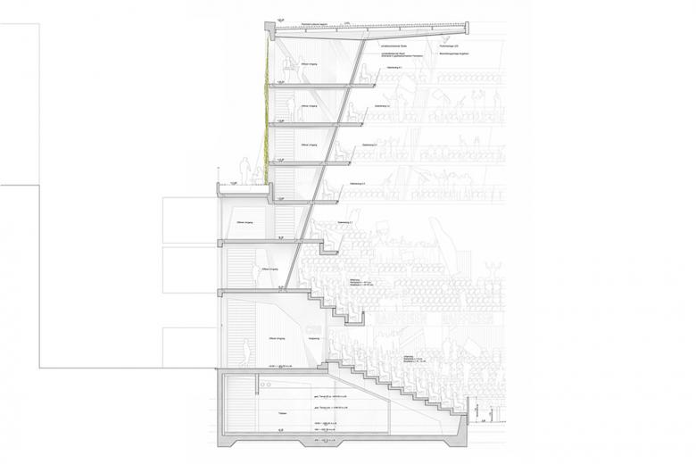 Externally, the stadium is mainly an open structure. Accordingly, the common and circulation areas are designed as open, unheated areas wherever possible. Individual uses can be heated as boxes in this system. In order to take the noise of the event into account, the spectator terraces are acoustically separated from the walkways.