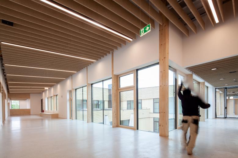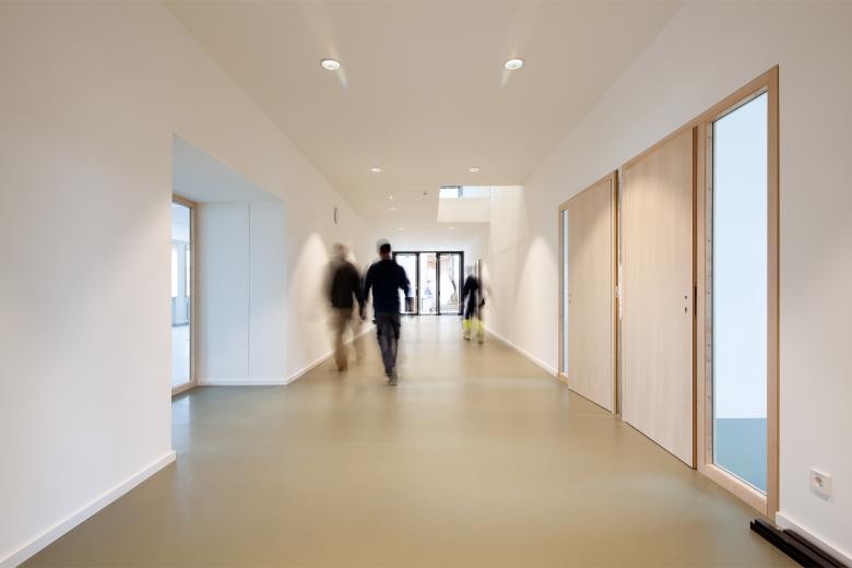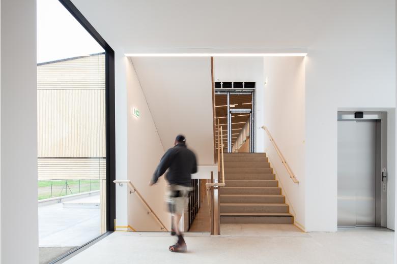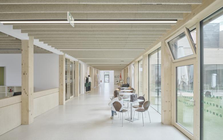 Der Neubau wird barrierefrei erschlossen und löst mit einem Stiegenhauskern geschickt die Split-Level-Anbindung an den Altbau. Die funktionelle Gliederung des Um- und Zubaus besticht durch seine klare Einfachheit und trägt so zu einer guten Orientierung im Gebäude bei. Die Anordnung des Schulrestaurants im Innenhof stellt einen zentralen Mittelpunkt der Schule dar, die das tägliche Leben einer HLT repräsentiert.