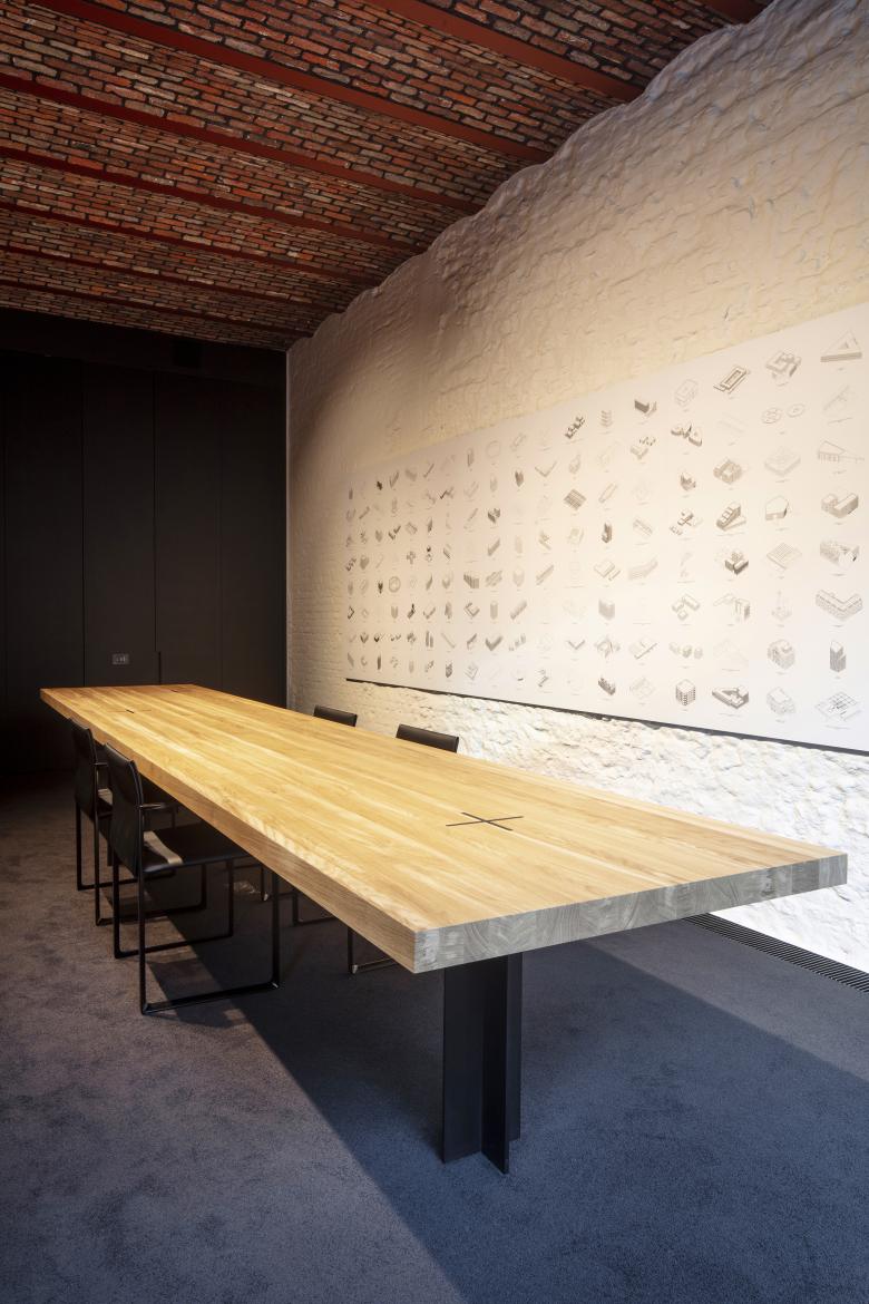 Inside, each floor has its own character: a ground floor meeting floor with terrazzo floor, an underground lunch room with voids on the front wall, a first work floor with wide wooden plank flooring and under the roof with Polonceau trusses, a completely white workspace with cathedral allure is created. The soul of the building is preserved and together with the finish, forms a powerful whole.