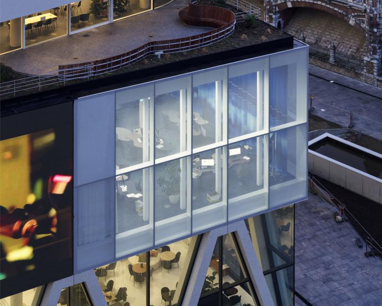 In the glass box on N+2 and N+3 there is a news studio from where VTM news is broadcast several times a day. The dynamic character of the building is enhanced by this news studio and the various editors around it.