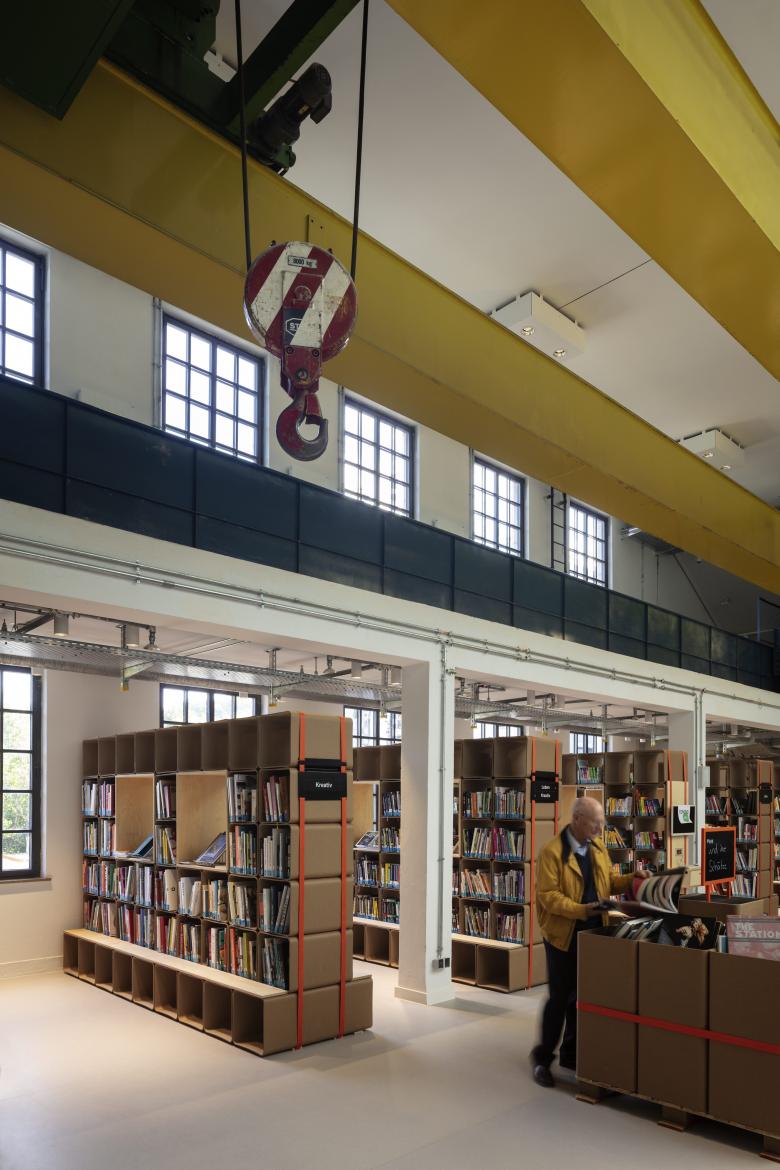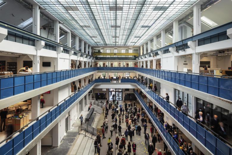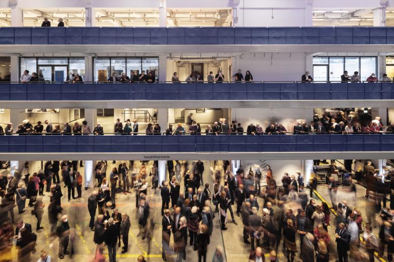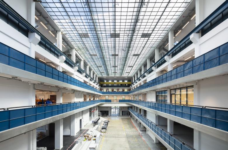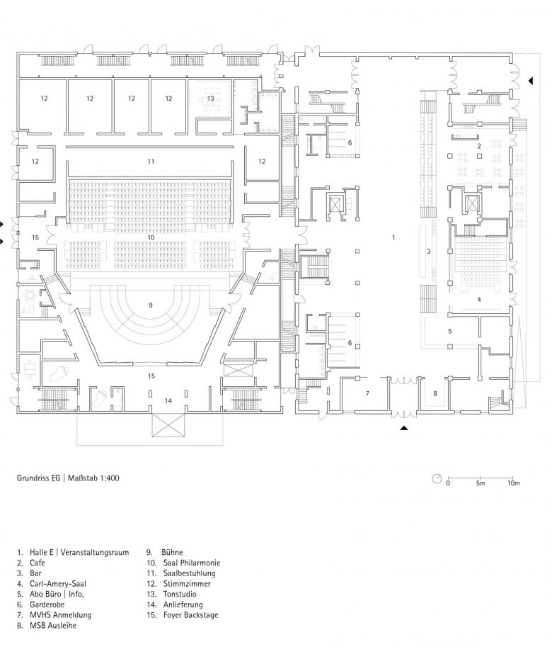 By utilizing Hall E for the HP8 center, a new public facility is being created at the banks of the River Isar, which will exist beyond the Gasteig use period. At the same time, the industrial character dating from 1929 will be preserved. The external appearance is dominated by concrete and red-brick facades, whereas the interior features a building-high atrium with top lighting and blue balcony railings fronting the surrounding tiers. In addition to the Isarphilharmonie foyer on the first floor, a branch of the Munich Public Library with an events venue, seminar and meeting rooms, and arts agency and eatery premises round off the room schedule, thereby creating a public space that will be popular and busy throughout the day.