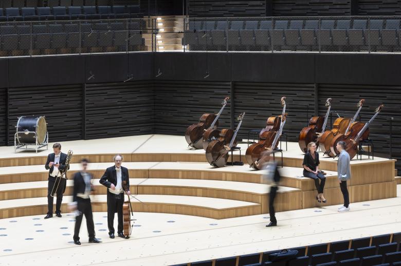 The existing building and the new modular building are separated by a glazed joint, which also contains the access steps to the concert hall. The new building is made up of two separate construction systems: the core of the building is the concert hall in modular timber construction. In cooperation with structural engineers schlaich bergermann partner sbp, gmp developed the hall as a push-fit system of solid timber elements. To shorten the construction period, these elements were prefabricated while the outer steel structure was being erected; they were then assembled on site and faced with an industrial cladding system suitable for the time-limited service life. The use of single-skin floor and wall elements made it possible to further reduce the construction period. “Like a violin in its case, the concert hall has been designed as a building within a building. The modular timber building fits into the system construction shell, which is reduced to its basic protective function; taking into account precise acoustic requirements, the design has been completed to the last detail”, Stephan Schütz, partner at gmp, summarizes the design concept.