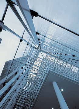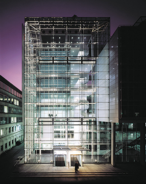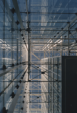 The main entrance and glass atrium of the long primary building serve as an extension of the connection corridor and exemplifies the overall unique design and future prominence of the project.