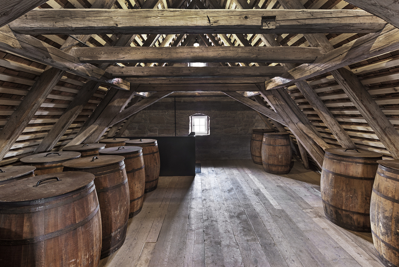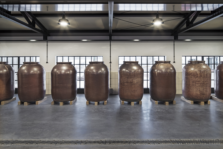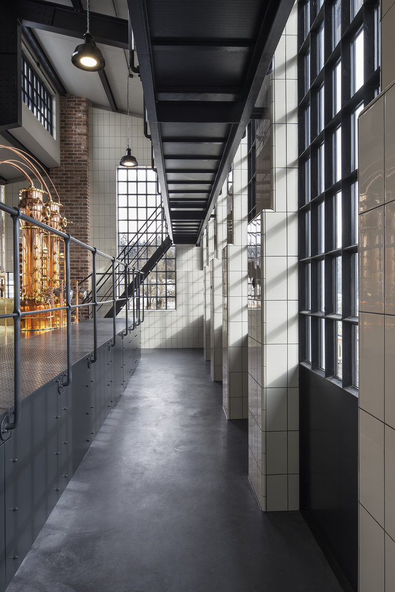 Featuring the materials copper, brass and stainless steel, the 150 sqm distillery building with extra high ceilings houses the core of the Monkey 47 Black Forest Distillery: a custom designed distillery boiler built by the German copper smith Arnold Holstein. Large steel windows provide ample daylight and a great view into the valley and the surrounding landscape.